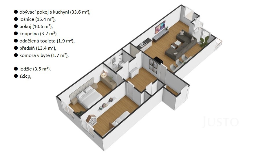 Byt je světlý, vzdušný, prostorný a ve skvělé lokalitě. Jeho velikost je 80 m² (88 m² včetně svislých konstrukcí) + lodžie 3,5 m² + sklep 2 m². Velkou výhodou tohoto bydlení je rozhodně jeho velikost, náklady na bydlení, lodžie, komora přímo v bytě, sklep, venkovní parkovací stání a umístění domu. Na lodžii si můžete vychutnat ranní kávu nebo si odpočinout po náročném dni.