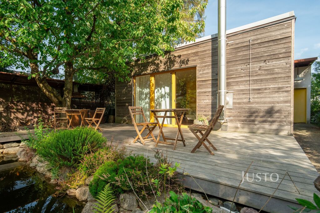 ● Velkým benefitem domu je jeho terasa. Představte si, že sedíte na terase, před vámi jezírko se zahradou, nad Vámi vzrostlá třešeň, popíjíte ranní kávu a posloucháte zpěv ptáků, nebo tu večer relaxujete po náročném dni. Je to vaše soukromá venkovní oáza.