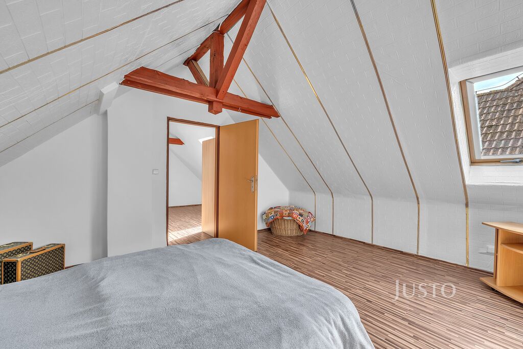 v patře pak jsou průchozí dvě ložnice a předsíň kde je schodiště a vestavěné skříně.