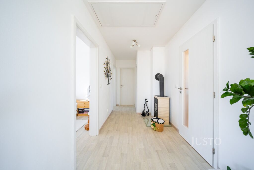 K dispozici jsou dvě samostatné ložnice – hlavní ložnice a druhý pokoj, který může sloužit jako dětský pokoj, pracovna nebo pokoj pro hosty. Komfortní zázemí zajišťuje elegantní koupelna s prostorným sprchovým koutem, umyvadlem a toaletou, kterou doplňuje ještě druhá, samostatná toaleta s umyvadlem. Praktická šatna a technická místnost pak výrazně usnadní každodenní fungování.
