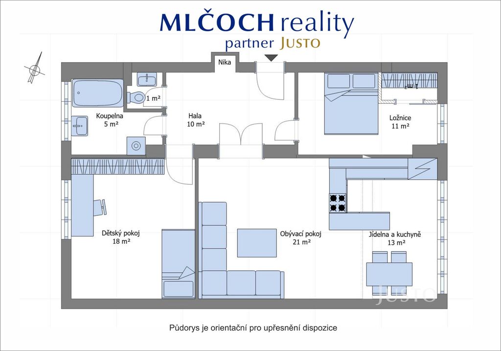- 1. ložnice jako dokonalý dětský pokoj s třílůžkovou palandou (jedno lůžko vysouvací), psacím stolem a vestavěnými úložnými prostory, vše vyrobeno zakázkově na míru