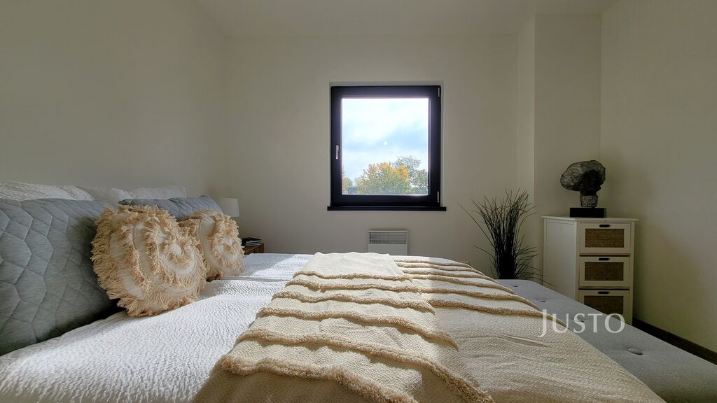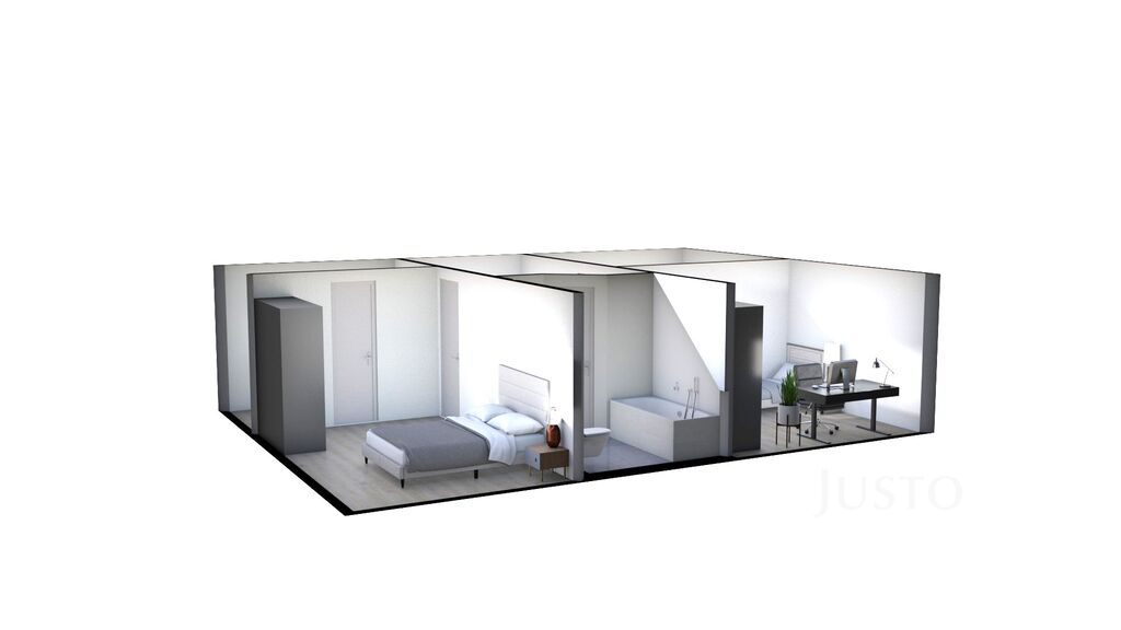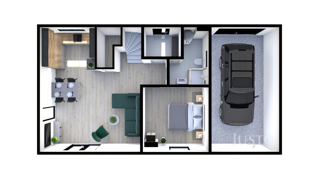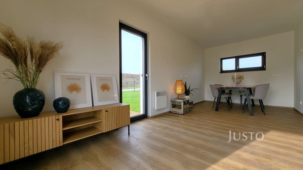 V přízemí najdete zádveří, obývací pokoj s kuchyní dohromady, spíž, ložnici a koupelnu se sprchovým koutem, ve které je umístěna technologie domu. Pokud podnikáte, můžete přízemní pokoj využít pro tyto účely. Návštěvy Vám tak nebudou chodit přes dům.