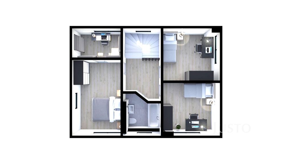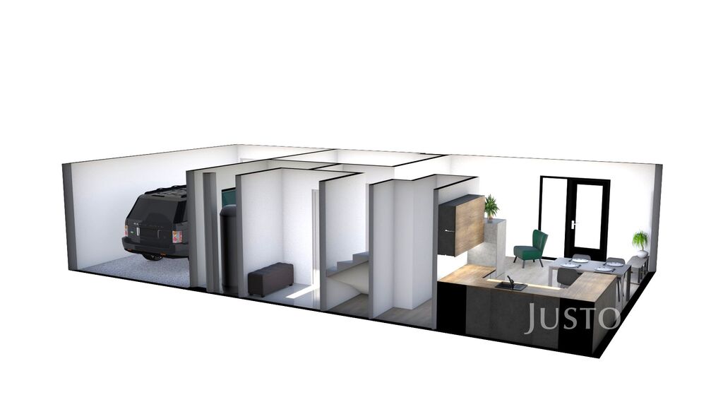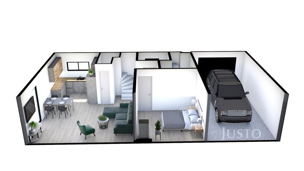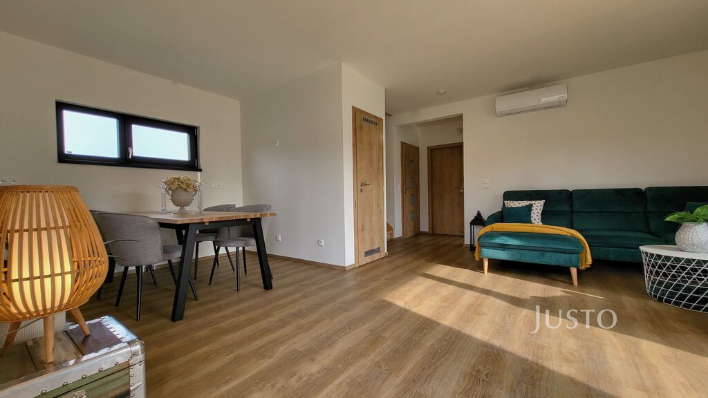 Dům je dispozičně řešen jako 5+kk se dvěma koupelnami, šatnou, garáží a terasou.