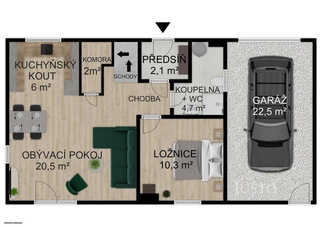 Vedle domu je garáž se sekčními vraty na dálkové ovládání.