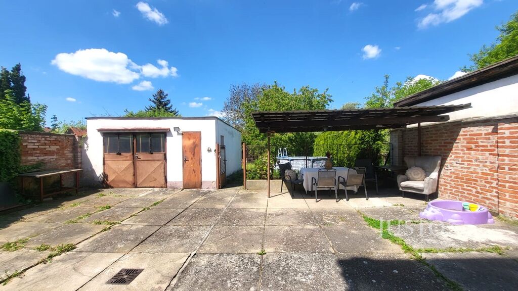 Na uzavřeném dvoře, se nachází garáž s dílnou a kryté posezení.