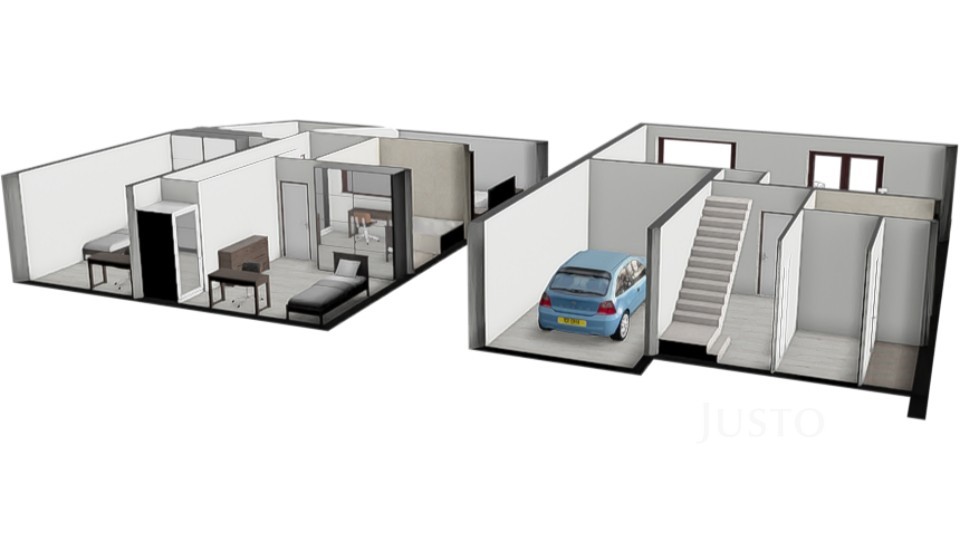 • V přízemí je prostorný obývací pokoj s kuchyňským koutem s přímým vstupem na terasu a dále pak na zahradu