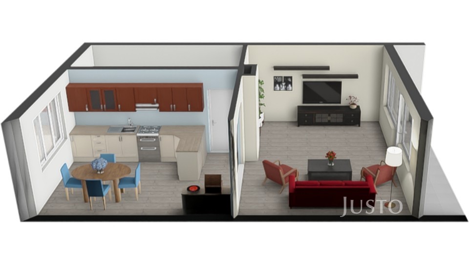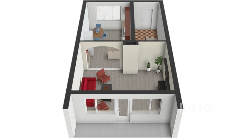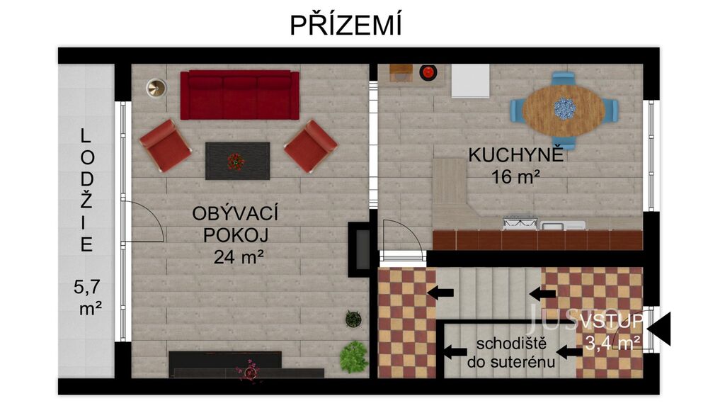 Přízemí (52,4 m²): kuchyně + prostorný obývací pokoj se vstupem na lodžii.