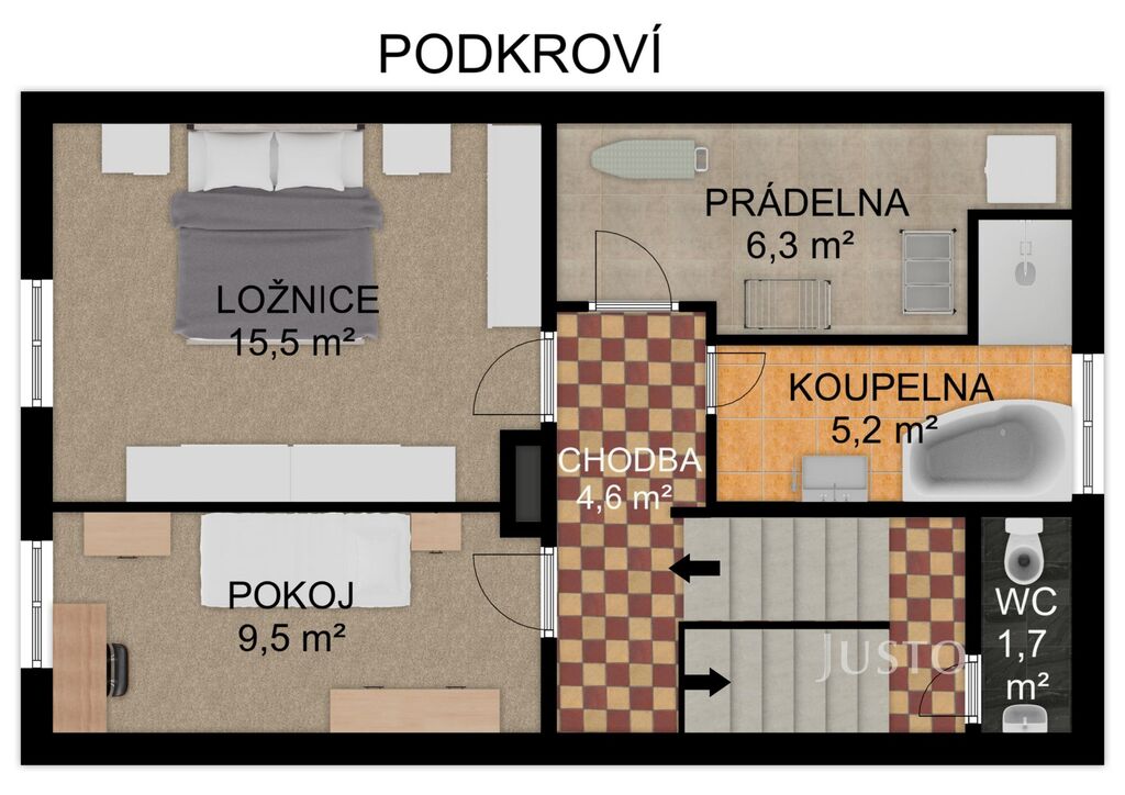 Podkroví (47,9 m²): 2 ložnice, koupelna (vana + sprcha), víceúčelová místnost, vstup na půdu.