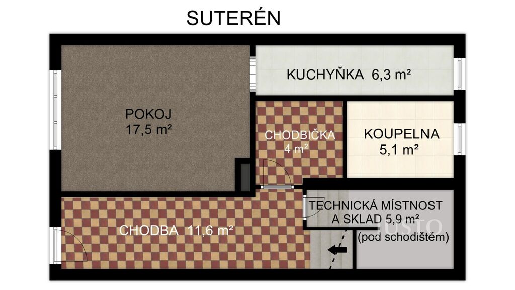 Suterén (52,7 m²): technická místnost (plynový kotel se zásobníkem TUV), sklepní zázemí, příprava pro byt 1+1.