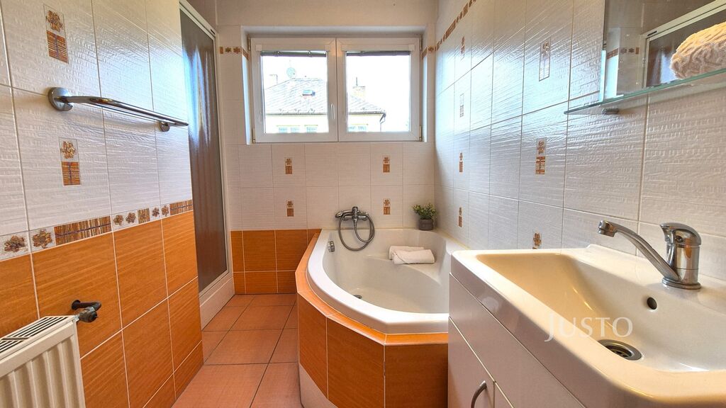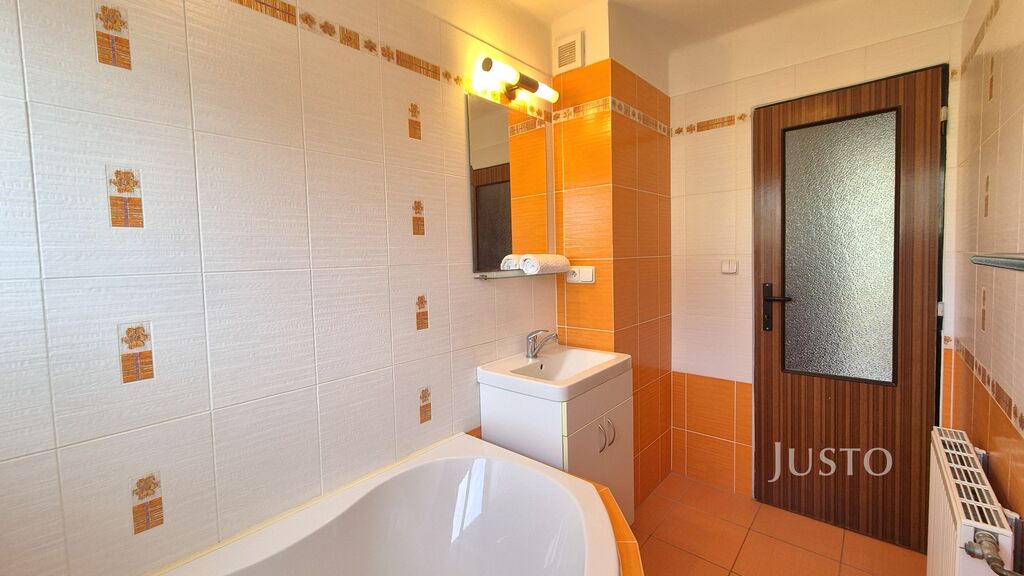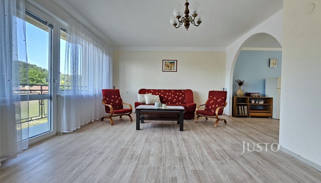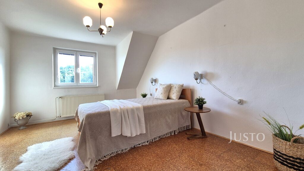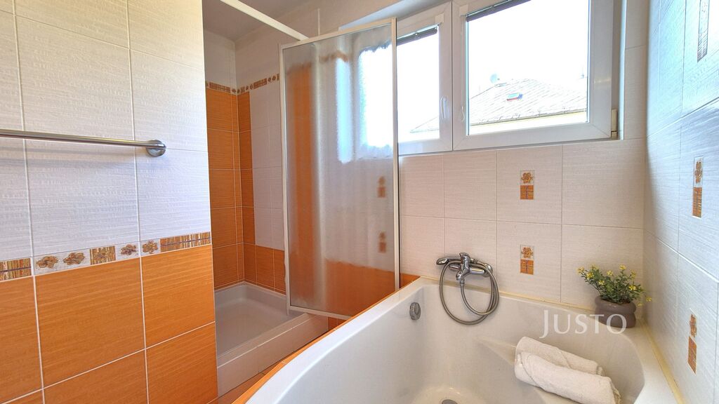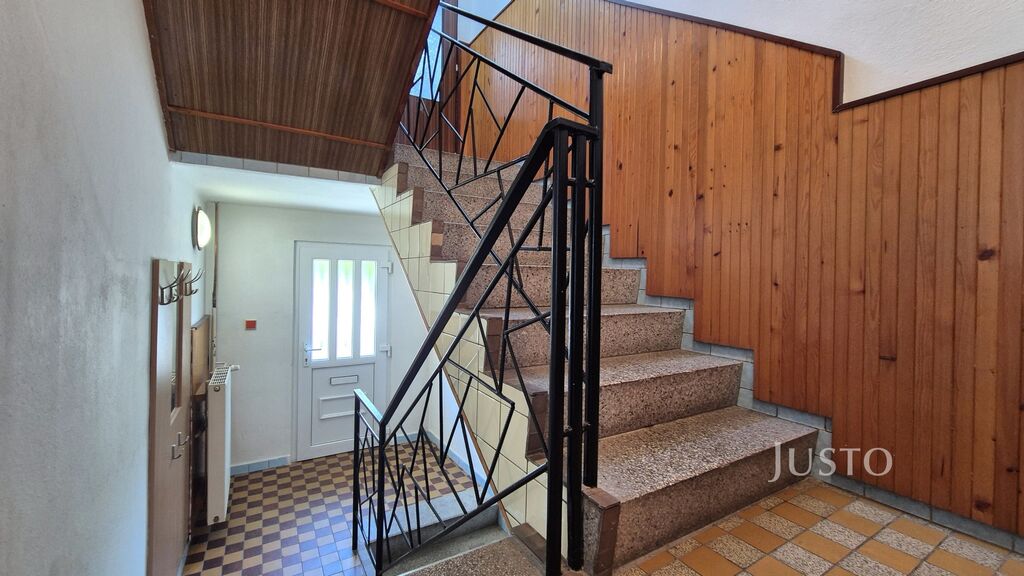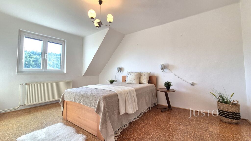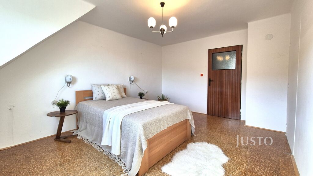 Dost místa pro všechny (4+1, 150+ m²): v přízemí velký obývák s kuchyní a vstupem na lodžii s krásným výhledem; v podkroví dvě útulné ložnice, koupelna s vanou i sprchou a praktická víceúčelová místnost (šatna/prádelna/kancelář).