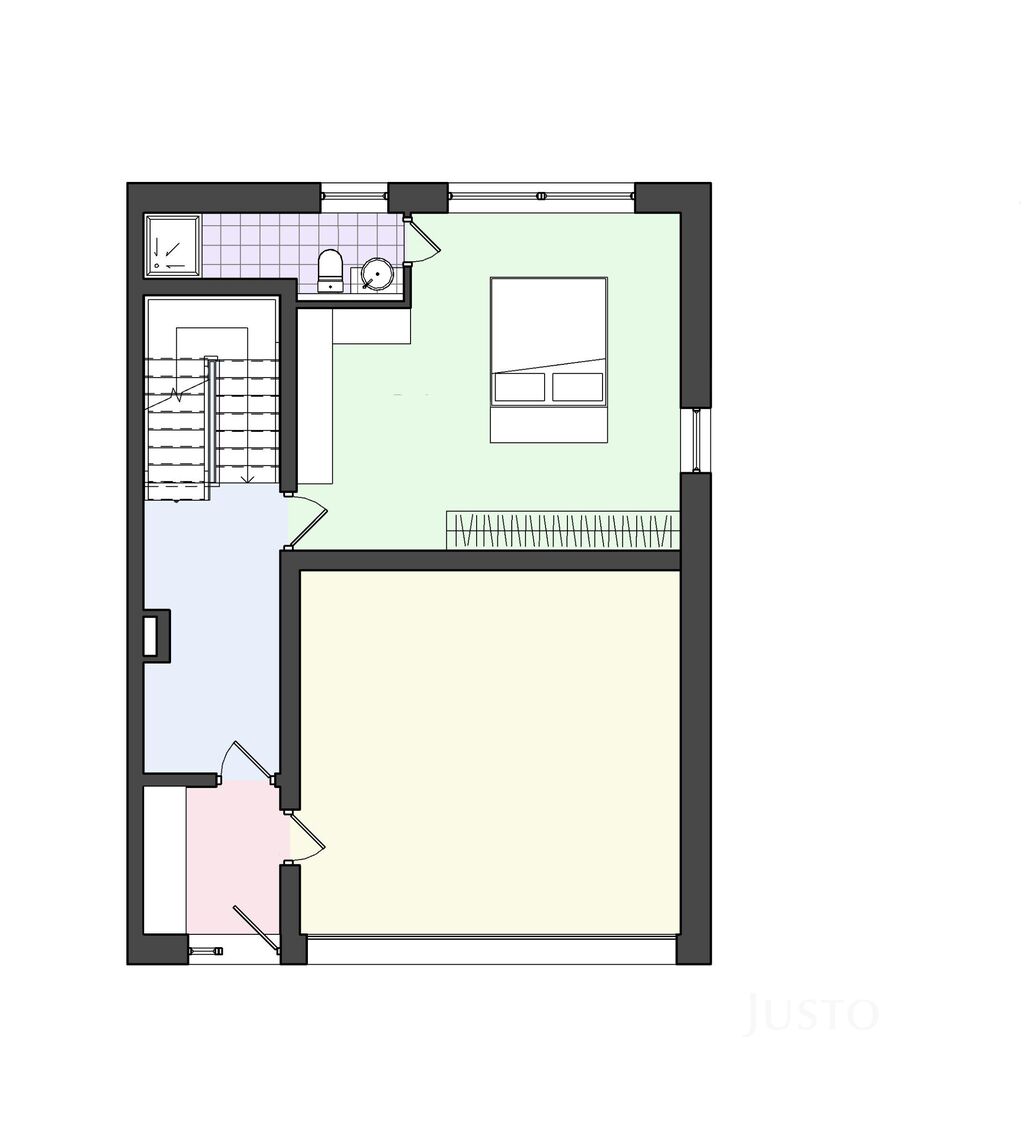 1. nadzemní podlaží (vstupní úroveň) nabízí zádveří, garáž pro parkování dvou vozů vedle sebe, ložnici, toaletu
