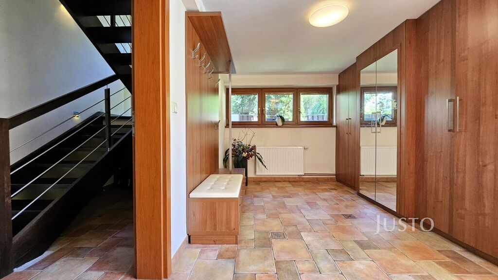 V přízemí se nachází velkorysá vstupní hala (12,3 m²), dodává celému interiéru vzdušný ráz. Hala navazuje přímo na garáž (33 m²)pro dva osobní vozy. K dalšímu ev. parkování poslouží zpevněná plocha před garáží. Další části přízemí je posilovna (21,9 m²), místnost se saunou (17,2 m²), která je s vlastním sprchovým koutem a toaletou. Z obou těchto místností lze vyjít na zahradu s bazénem. Místnost se saunou by bylo možné upravit k trvalému bydlení nebo případně k využití pro drobné podnikání. Technická místnost (6,5 m²) tč. slouží jako spíž a úložné prostory.