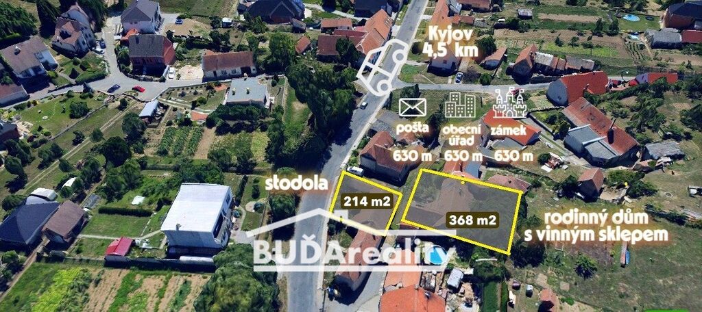 Prodávaný pozemek s domem se nachází v centrální části obce. Jejich součástí je budova, která je určená spíše k demolici. Pozemek, kde stojí dům, má výměru 368 m2. V zadní části zahrady se nachází vinný sklep umístěný v zemi, je ve velmi dobrém stavu. Má délku 10- 12 m. Stěny jsou obložený cihlami.