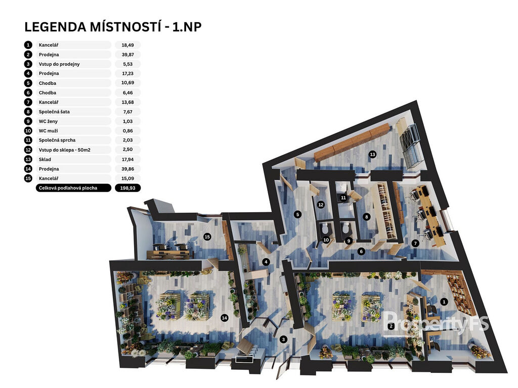 Současně s květinářstvím lze zakoupit také celou budovu s bytem 8+kk (270 m²), dalšími sklady, půdními prostory, terasou a druhou polovinou parkovacího stání. Podrobnosti a půdorysy viz poslední foto v inzerci.