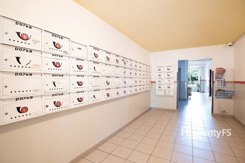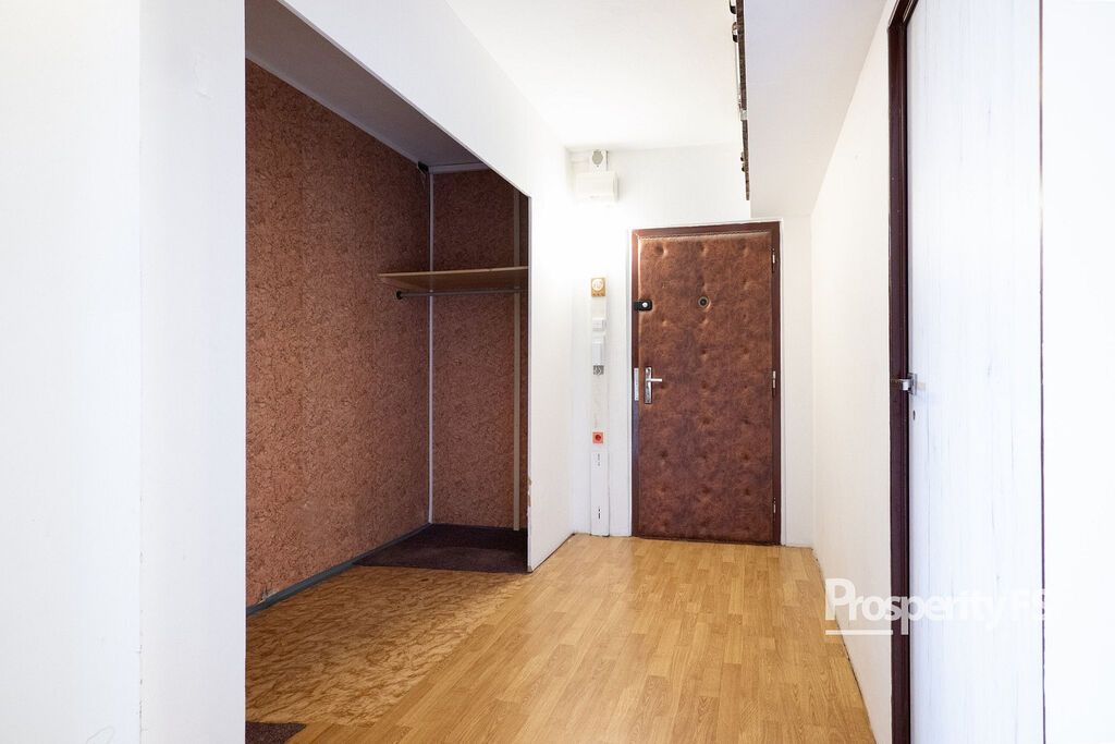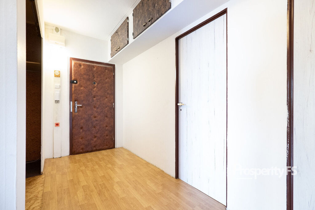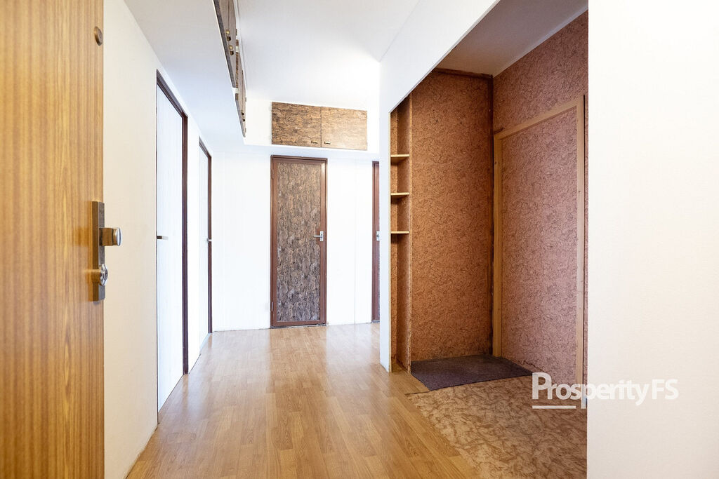 Ještě před vstupem do bytu máte k dispozici sdílenou a uzamykatelnou chodbu, kam si můžete odložit kabát nebo botník. Byt samotný prošel částečnou rekonstrukcí v podobě změny dispozice z 3+1 na 3+kk vybouráním příčky, spojením obývacího pokoje s kuchyní a díky tomu dispozice působí více prostorně. Velkou výhodou je šatna hned za vchodovými dveřmi o zhruba 2 m². Jádro koupelny a toalety je ponecháno umakartové, nicméně koupelna dostala nové obložení s vanou a zrcadlovou skříň.