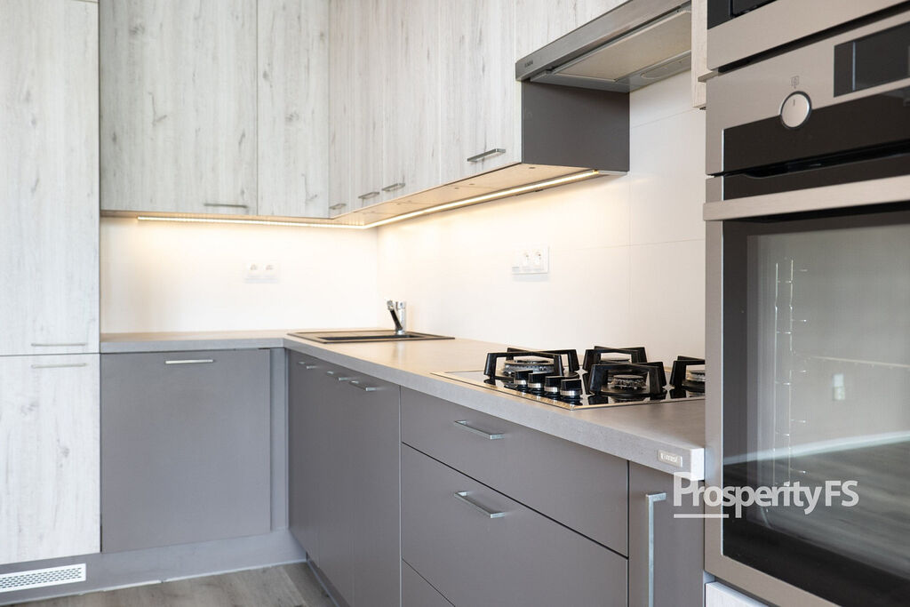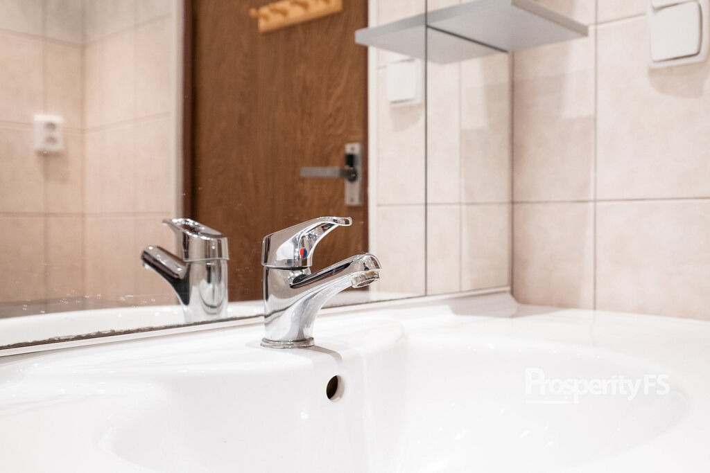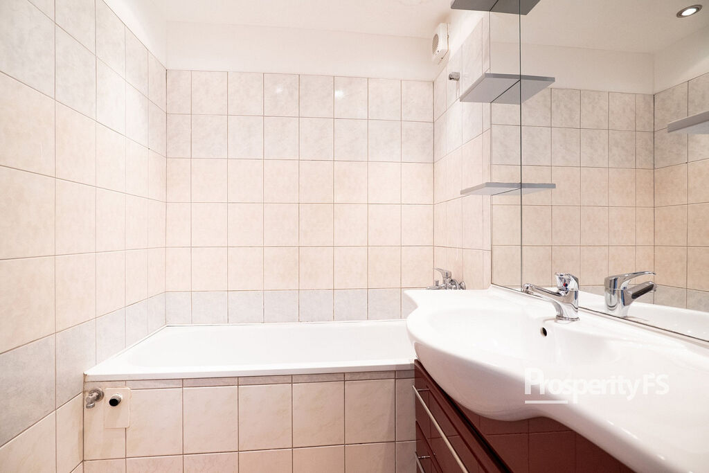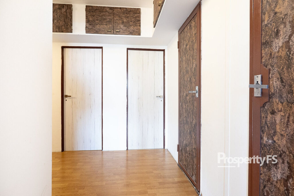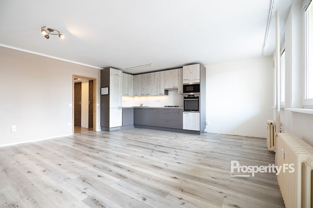 Ještě před vstupem do bytu máte k dispozici sdílenou a uzamykatelnou chodbu, kam si můžete odložit kabát nebo botník. Byt samotný prošel částečnou rekonstrukcí v podobě změny dispozice z 3+1 na 3+kk vybouráním příčky, spojením obývacího pokoje s kuchyní a díky tomu dispozice působí více prostorně. Velkou výhodou je šatna hned za vchodovými dveřmi o zhruba 2 m². Jádro koupelny a toalety je ponecháno umakartové, nicméně koupelna dostala nové obložení s vanou a zrcadlovou skříň.