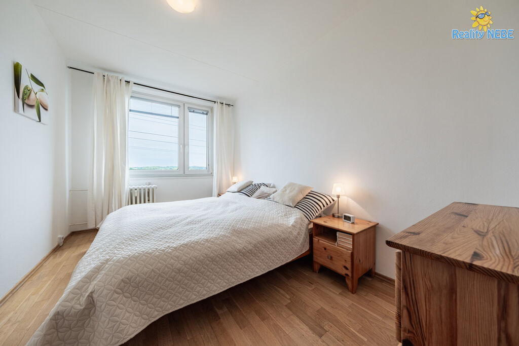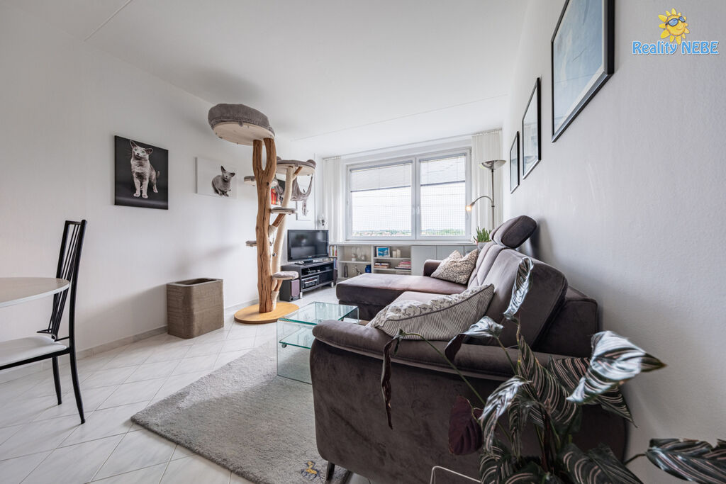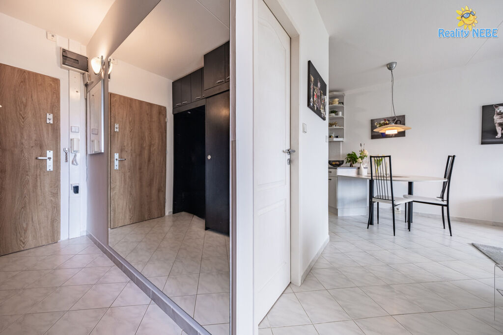 Skládá se ze samostatné ložnice, obývacího pokoje se kuchyňským koutem (linka s vestavnými spotřebiči - lednice s mrazákem, el. varná deska, trouba, digestoř, mikrovlnná trouba, možnost pračky a barovým pultem). Koupelna se sprchovým koutem a WC. Ve vstupní chodbě se nacházejí vestavné šatní skříně, byt má bezpečnostní dveře a náleží k němu sklepní kóje v suterénu domu.