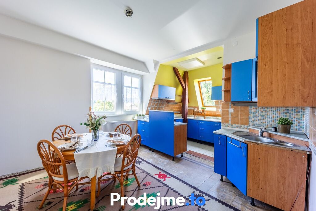 Po zachovalém dobovém schodišti se zábradlím vystoupáte do druhé bytové jednotky. Také tato část domu má dispozici 3+kk o ploše 81 m2. Poskytuje jídelnu s kuchyňským koutem, prostornou ložnici, další pokoj a velkou koupelnu se sprchovým koutem i vanou.