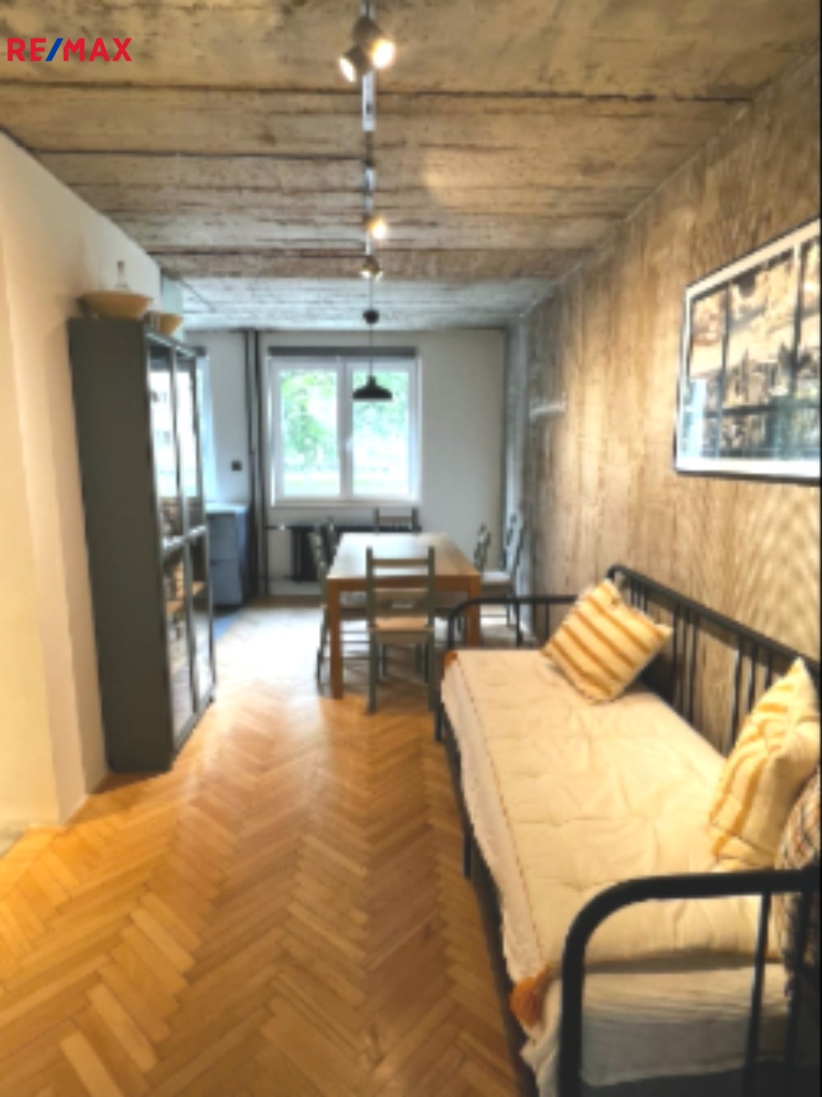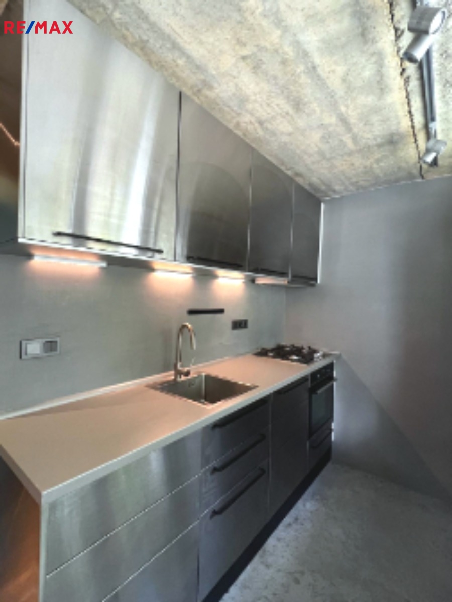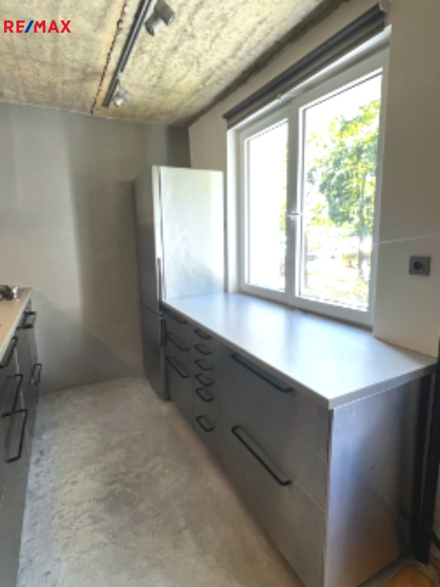 Nabízíme k pronájmu jedinečný byt 2+kk (původně 4+1), o podlahové ploše cca 73 m2 + lodžie 4 m2 , v 1. nadzemním podlaží bytového domu v pražských Záběhlicích, který prošel promyšlenou rekonstrukcí a nabízí originální atmosféru industriálního stylu. Úpravou dispozice vznikl vzdušný, otevřený prostor s podlahovou plochou cca 41 m², propojující kuchyň, jídelnu a obývací část. Jednotlivé části jsou pouze opticky rozděleny a navazují na předsíň. Kuchyňská linka je plně vybavena: plynová varná deska, elektrická trouba, myčka, lednice s mrazákem a pračka se sušičkou. Z otevřené předsíně je vstup do koupelny se sprchovým koutem a samostatné toalety. Ložnice o velikosti cca 23 m² nabízí 7 vestavných skříní a přímý vstup na zasklenou lodžii. Další úložné prostory zajišťuje vestavná skříň v předsíni. Orientace bytu na západ (kuchyň, jídelna) a východ (obývací část, ložnice, lodžie) zajišťuje dostatek denního světla po celý den.