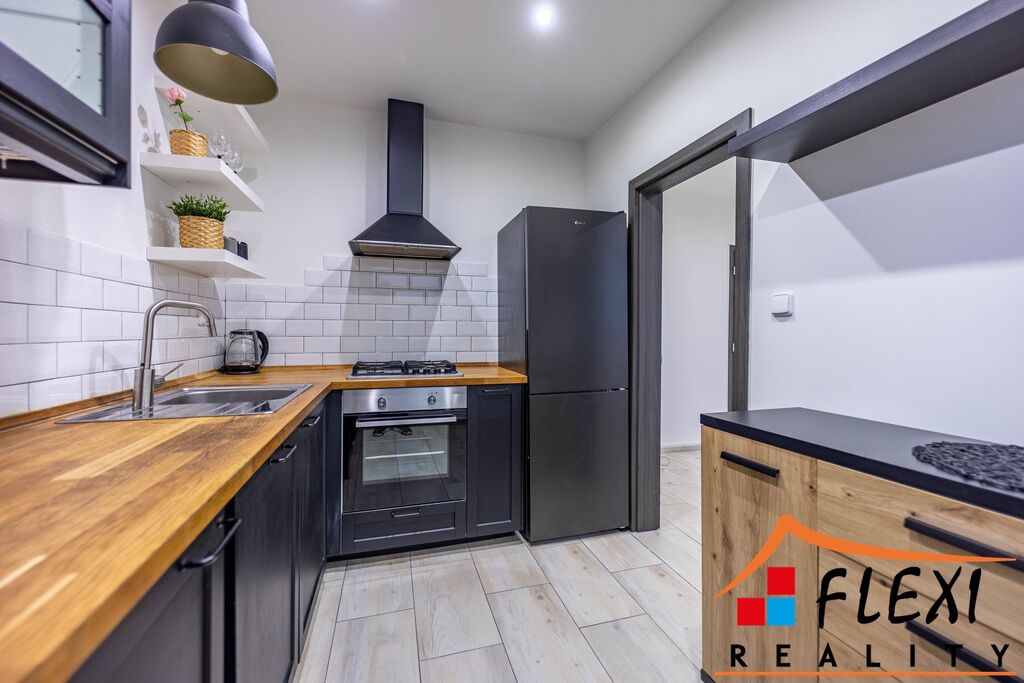 Součástí kuchyně je vkusná kuchyňská linka černé barvy s pracovní deskou v dekoru dřeva a vestavěnými spotřebiči, jako je myčka, horkovzdušná trouba, plynový sporák, mikrovlnná trouba, lednice s mrazákem a také pračka. A najdete zde i praktickou komodu s policemi a šuplíky.