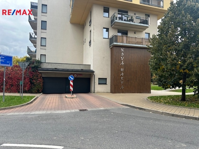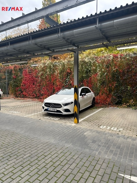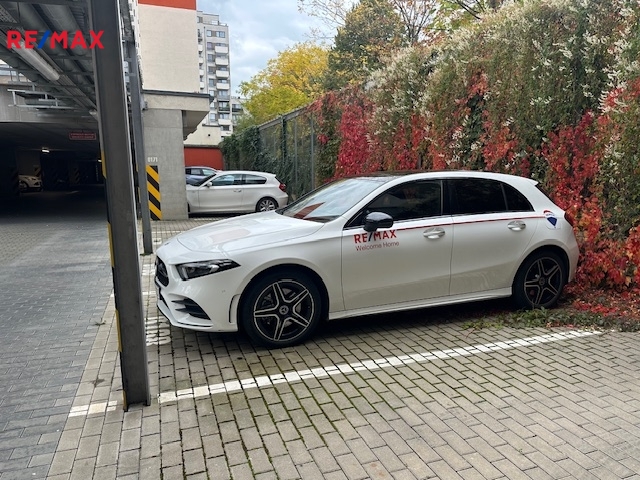 Garážové stání je umístěno ve vnitrobloku bytového komplexu (konkrétně zaparkován vůz Mercedes Benz třídy A - Remax).