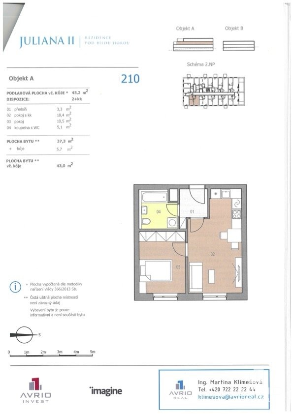 Nabízím k pronájmu útulný byt 2+kk o velikosti 45 m², který se nachází ve 3. NP (2. patro) moderní novostavby Juliana2 s výtahem. Menší bytový dům je klidný a splňuje kritéria nízkonákladového bydlení.