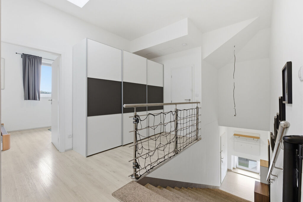 Dispozici bytu tvoří menší vstupní hala, schodiště do velké vstupní haly (17,5 m²) se skladem (3 m²) a vstupy do ložnice (21 m²), obývacího pokoje propojeným s kuchyní a jídelnou (55 m²), koupelny s toaletou a sprchovým koutem (5 m²) a průchozí šatny (8 m²) do ložnic (21 m²) a (20 m²) a druhé koupelny s WC a vanou (5 m²).
