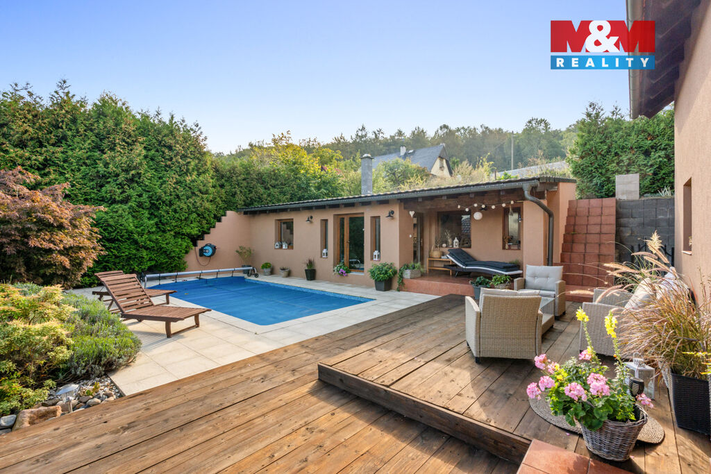 Sníte-li o bydlení v klidné a lukrativní lokalitě, tak Vás zveme do vyhledávané obce Chuderov do exkluzivního rodinného domu o zastavěné ploše 157 m2 na pozemku o rozloze 848 m² s výhledem do krásného okolí. Hlavní obývací část v přízemí zahrnuje plně vybavenou kuchyň se spižírnou, vstup na terasu, odkud se Vám otevře výhled na zahradu s jezírkem, pergolu s grilem, krbem, bazénem, solární sprchou a velkým bonusem je sauna, bar, kuchyňka, sprcha a WC v samostatné stavbě. Z předsíně jsou samostatné vstupy do pokoje, koupelny se sprchovým koutem a WC, technické místnosti, skladu a garáže. Ve druhém podlaží naleznete čtyři neprůchozí pokoje, koupelnu s vanou a samostatným WC. Velká půda vybízí k vybudování dalších obytných prostor. Dům se střešní krytinou - glazovaný Tondach, je vybaven moderními technologiemi jako podlahové topení, klimatizace a centrální vysavač, vnitřní a venkovní rolety, kazetové dveře a vlastní čistička. Přijďte se určitě podívat. Těšit se na Vás bude Bohuš a Zuzka