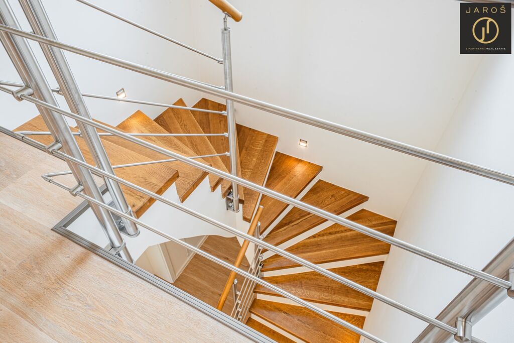 Vinylové podlahy, schody a madla z tvrdého dřeva, nerezové zábradlí. Interiérové dveře značky SAPELI.