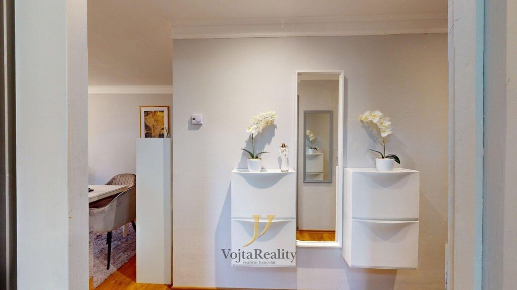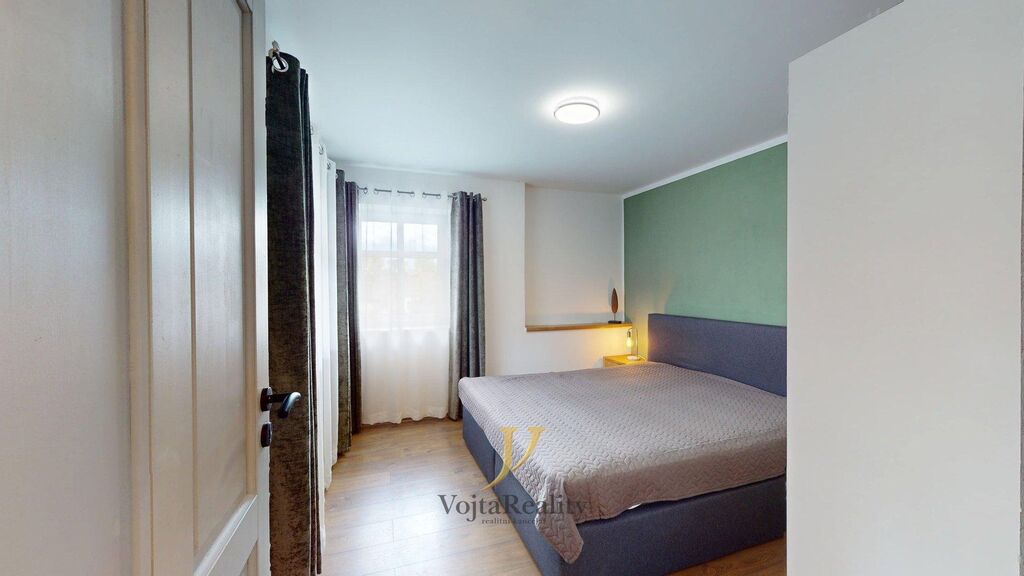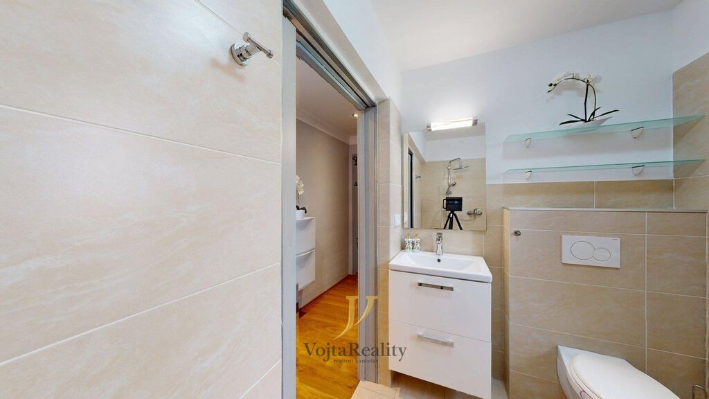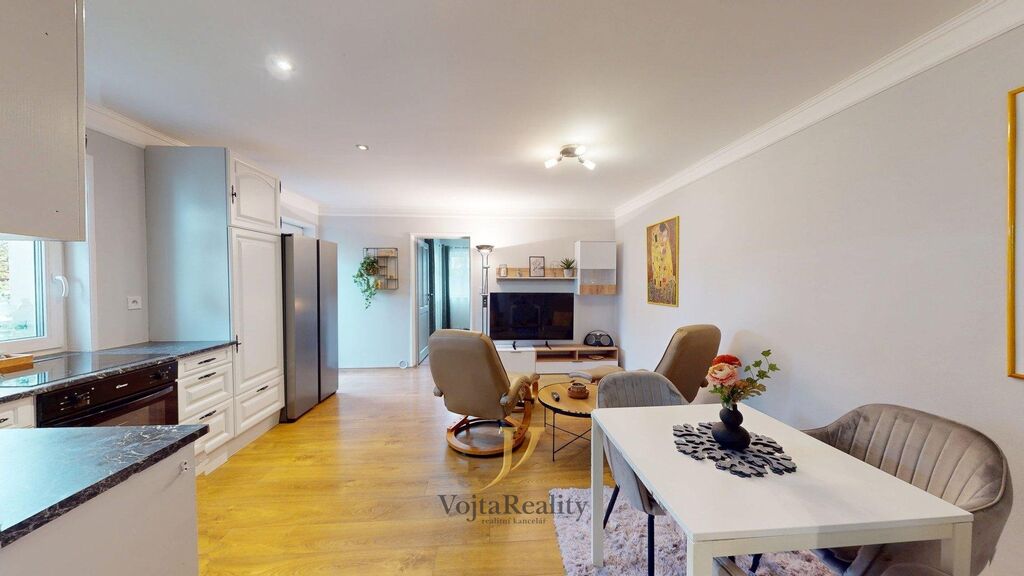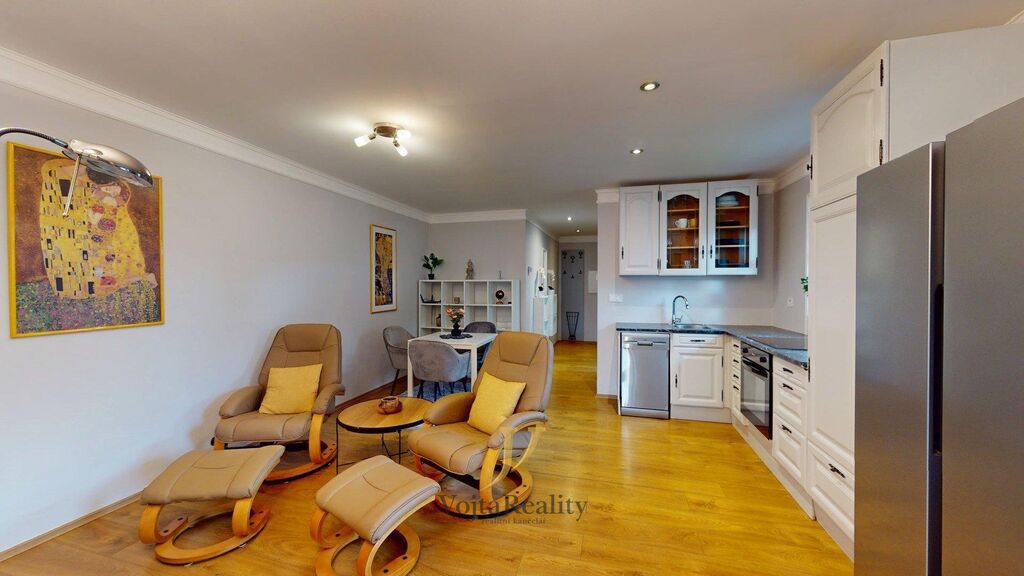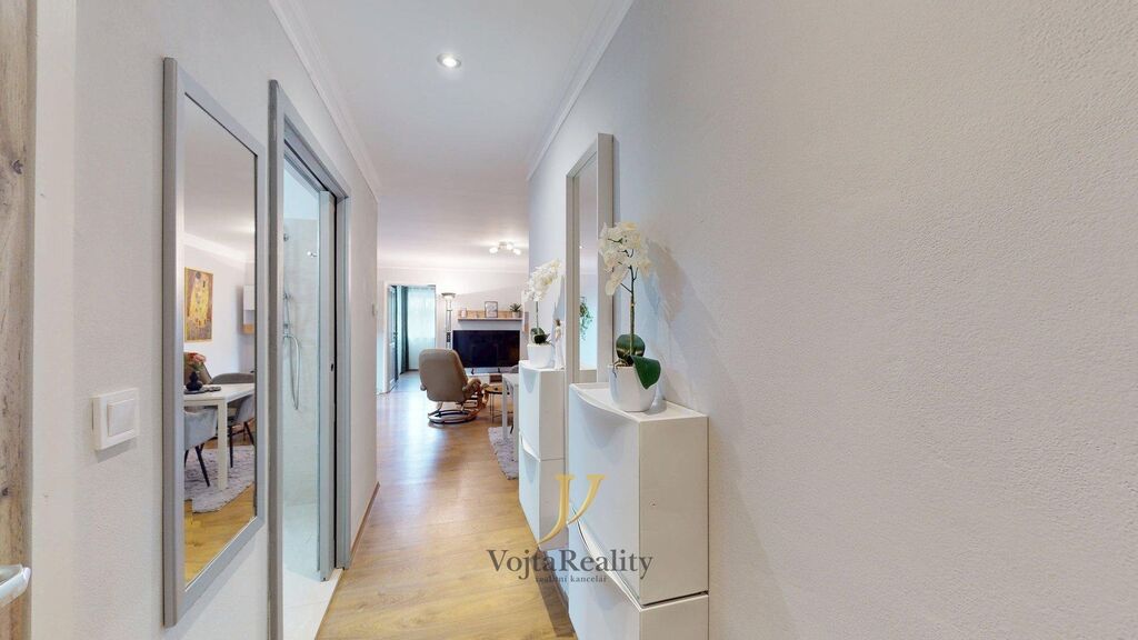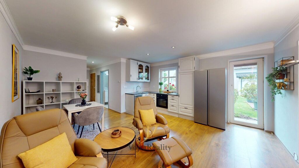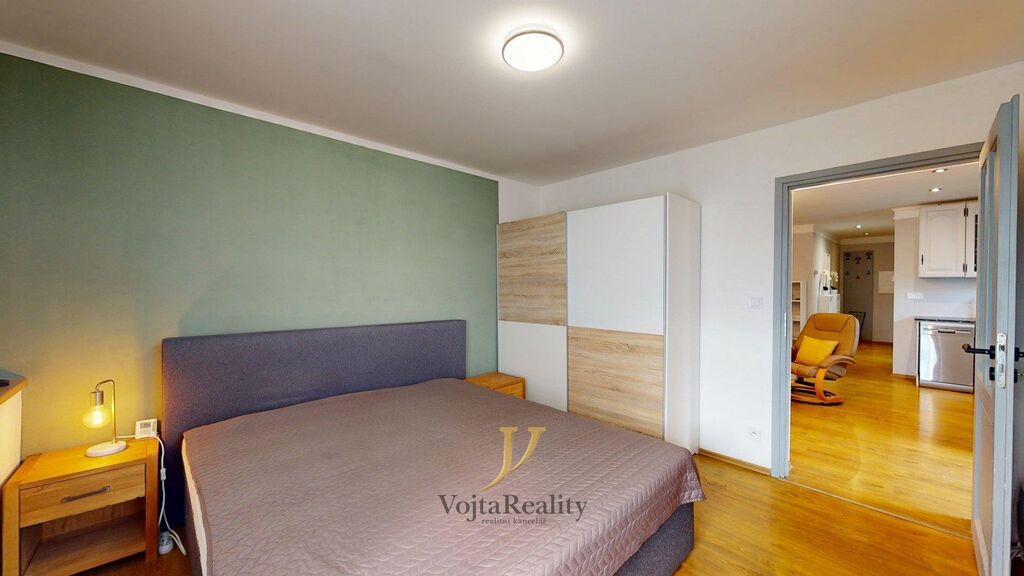 Bytová jednotka se nachází v 1. NP křídla domu ve vnitrobloku. Byt je dispozičně rozdělený na hlavní předsíň, která ústí v obývací část s kuchyňskou zónou. Ložnice je situovaná v koncovém traktu bytu. K bytu náleží přilehlá zastřešená terasa s posezením, taktéž lze využívat venkovní kuchyň s grilem, po dohodě s ostatními obyvateli domu.
