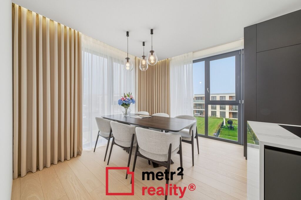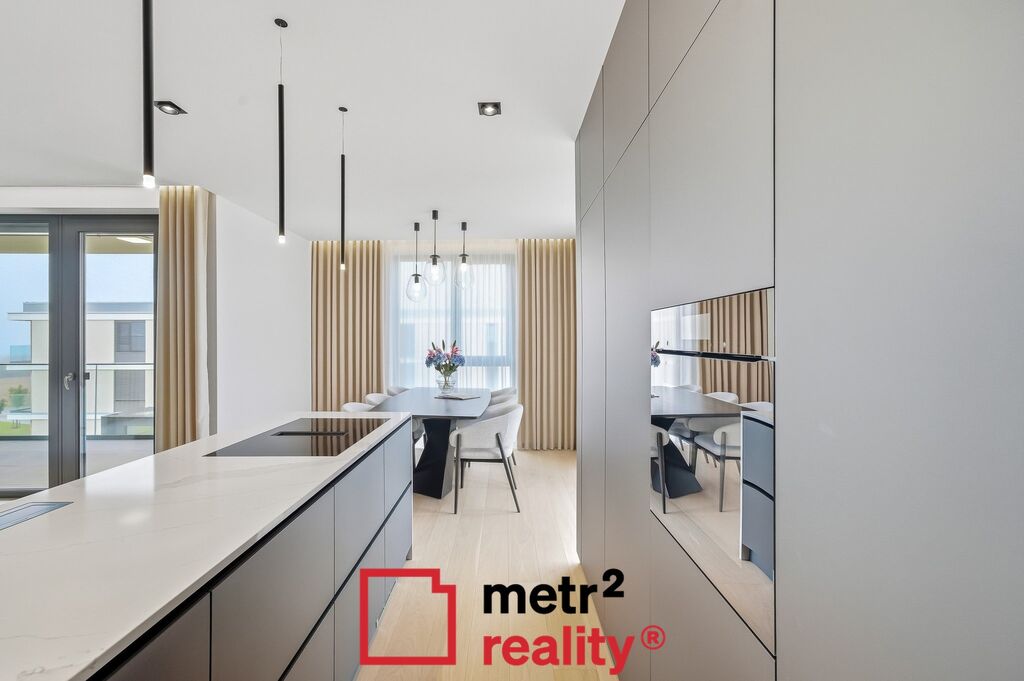 • Designová kuchyňská linka s vestavěnými spotřebiči Miele (nejvyšší řada), praktický jídelní stůl se židlemi a krásným výhledem tvoří přirozené srdce celého bytu