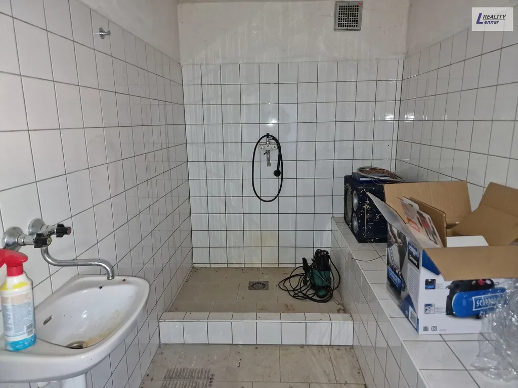 Je zde k dispozici zděná stavba o dispozici (garáž, kancelář, koupelna, WC s umyvadlem, zádveří, sklad – garáž/ dílna) se zastavenou