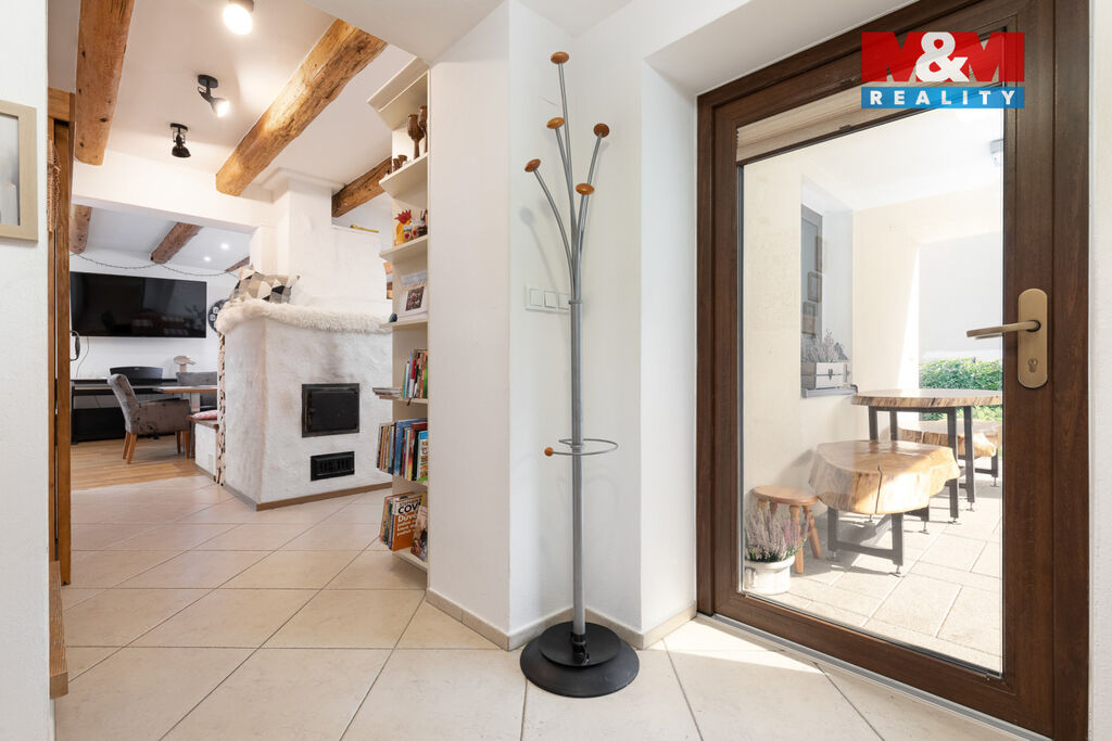 Dům se nachází na klidném místě, téměř na konci obce s přátelským sousedstvím, jehož tváří jsou jednoznačně pohádková kamna, která zdobí a propojují interiér a zároveň tak vyhřívají celé přízemí.