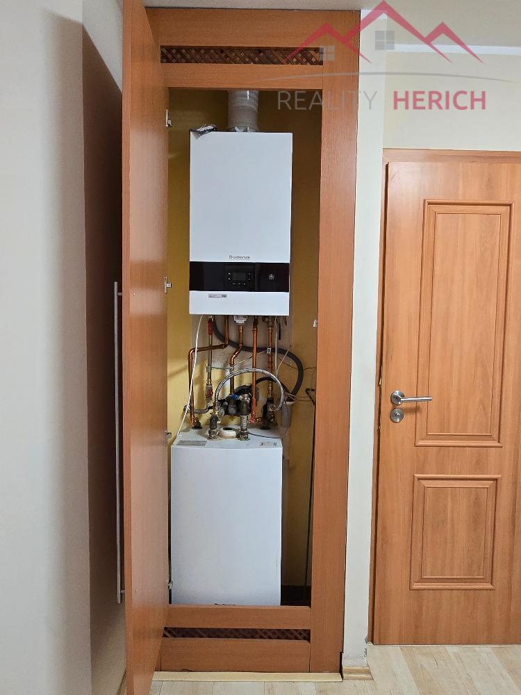 Vytápění je řešeno novým nástěnným kondenzačním plynovým kotlem LOGAMAX PLUS (2025). V obývacím pokoji jsou lokální krbová kamna. Dům je napojen na veřejnou vodovodní a kanalizační síť.