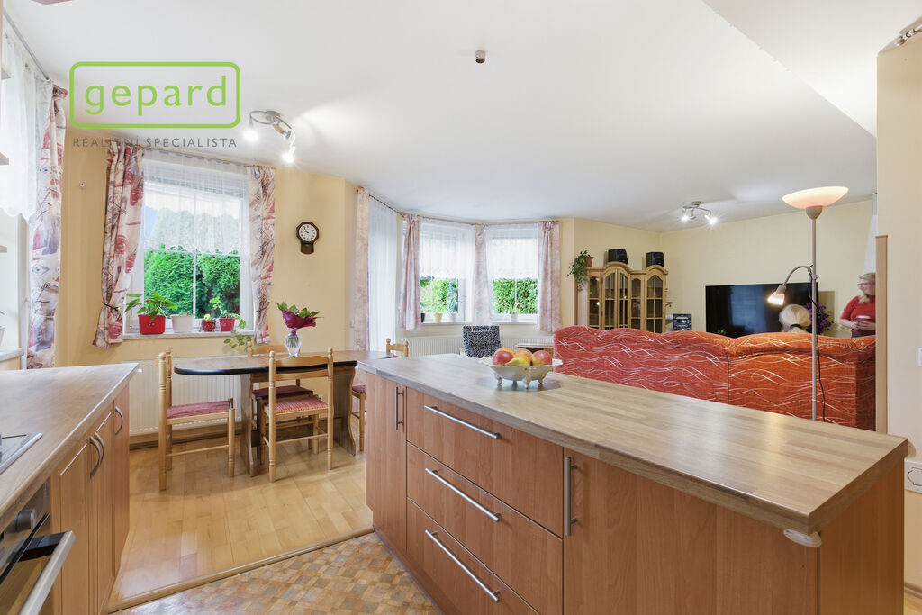V přízemí vás přivítá obývací pokoj s krbem, který je spojený s kuchyní a jídelnou. Také se odtud dostanete přímo na terasu a dále na zahradu, kde si užijete klid i soukromí.