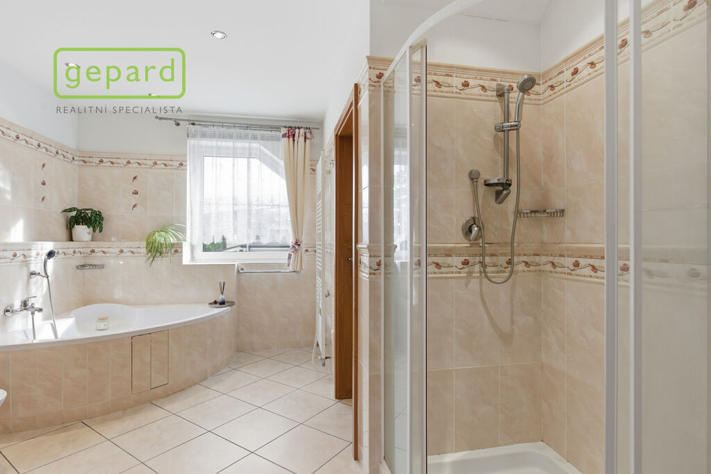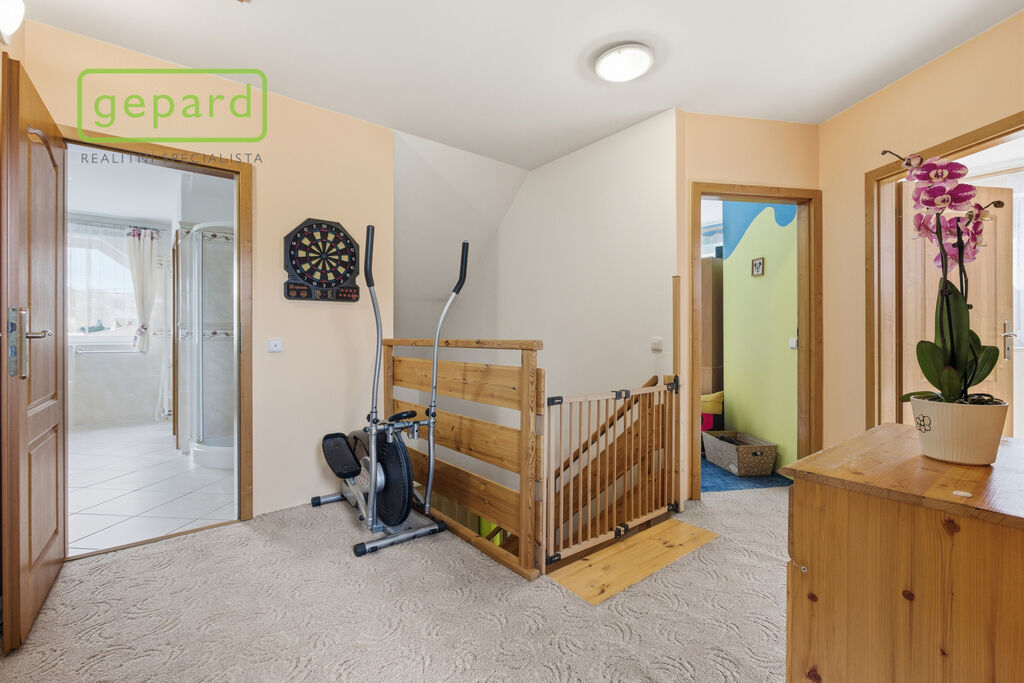 V patře jsou tři samostatné místnosti a velmi prostorná koupelna s vanou, sprchovým koutem, WC i bidetem. Z koupelny vede další místnost, která slouží, jako technické zázemí (pračka, sušička ap.). Dále se v patře nachází další úložná komora s výlezem na půdu.