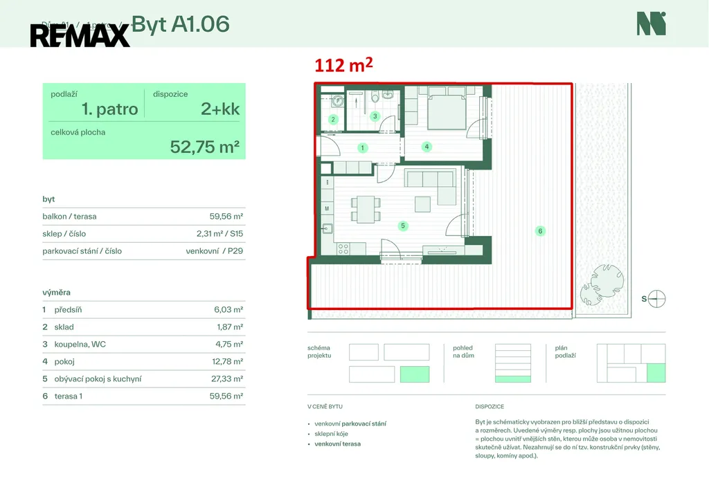 Nabízený byt A1.06 s plochou k užívání o výměře 112m2 se nachází ve zvýšeném přízemí domu A1. Užitná plocha samotného bytu je 55,51 m2 plus 59,56 m2 terasy plus 2,31 m2 sklep. Slunná a prostorná terasa je orientována jihozápadním směrem. Pochozí výška terasy asi 1 metr nad terénem plus zábradlí terasy s výškou zhruba 90cm zakončené truhlíkem pro pěstování zeleně Vám poskytne dostatek soukromí.