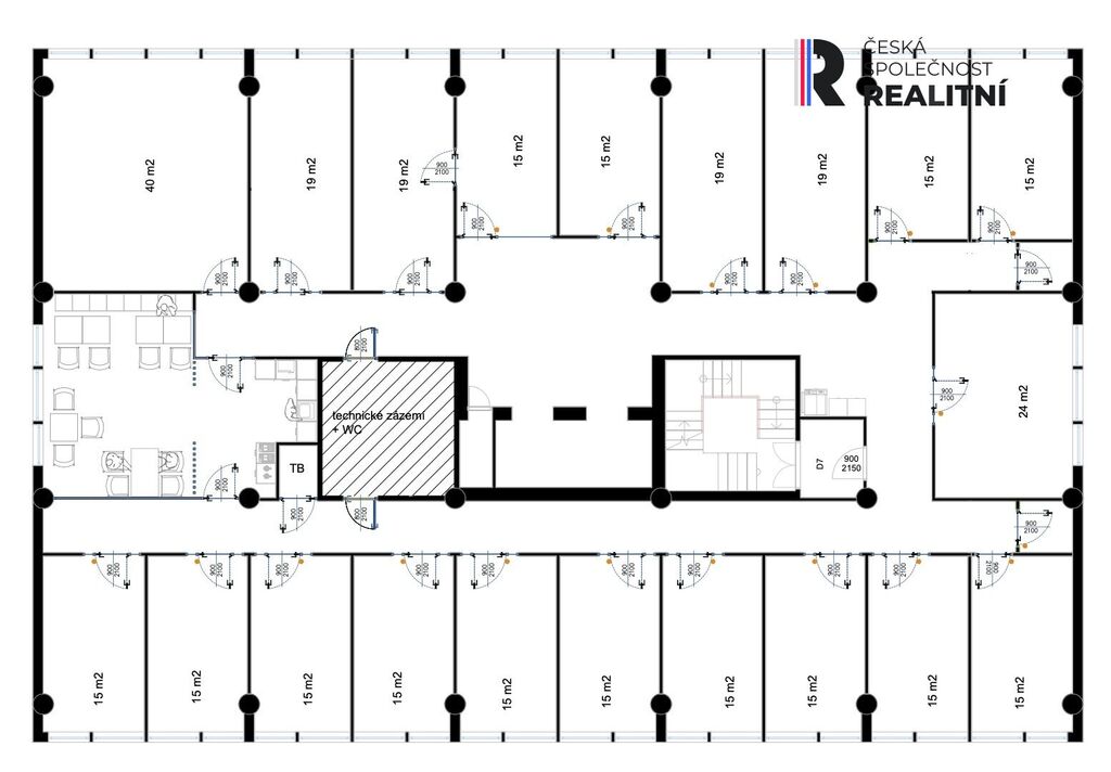 Jedná se o prostor celého patra. Orientační návrh rozložení kanceláří je pro představu přiložen k fotografiím.
