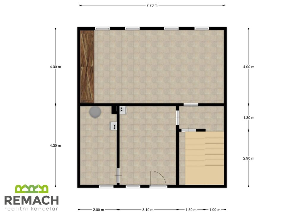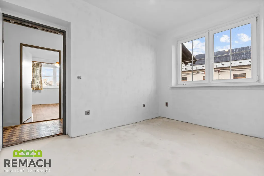 V horním podlaží jsou nyní dva pokoje, ale další půdní prostor lze využít k přestavbě na velmi rozsáhlý pokoj.
