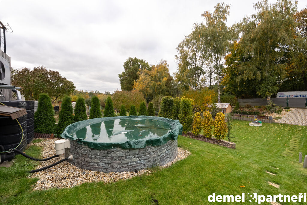 No a teď k tomu podstatnému. Zahrada... Tak tady ti bude patřit celkově 353 m², na kterých najdeš vlastní vrtanou studnu, jímku na vyvážení, ale hlavně bazén s tepelným čerpadlem. Zahrada je velmi udržovaná. Pažit jak na golfu, vzrostlá zeleň a okrasné květiny... To vše ti dá naprostý klid a pohodu.