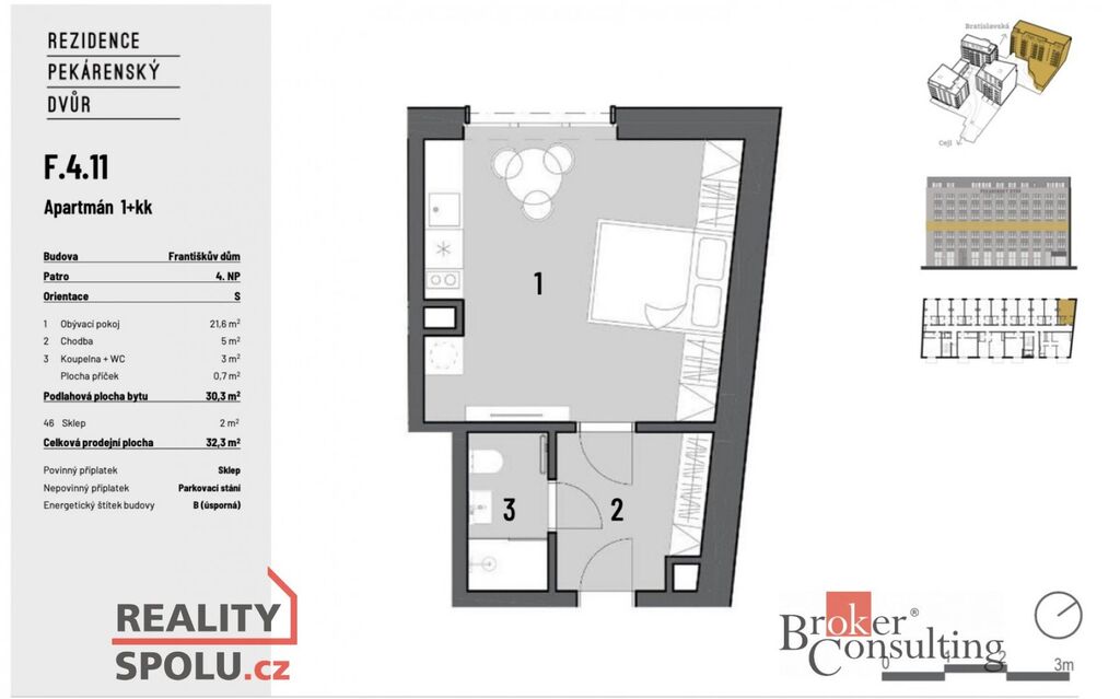 Nabízíme k pronájmu kompletně nový byt 1+kk o výměře 32 m² v prestižní novostavbě Rezidence Pekárenský dvůr na Bratislavské ulici v Brně.