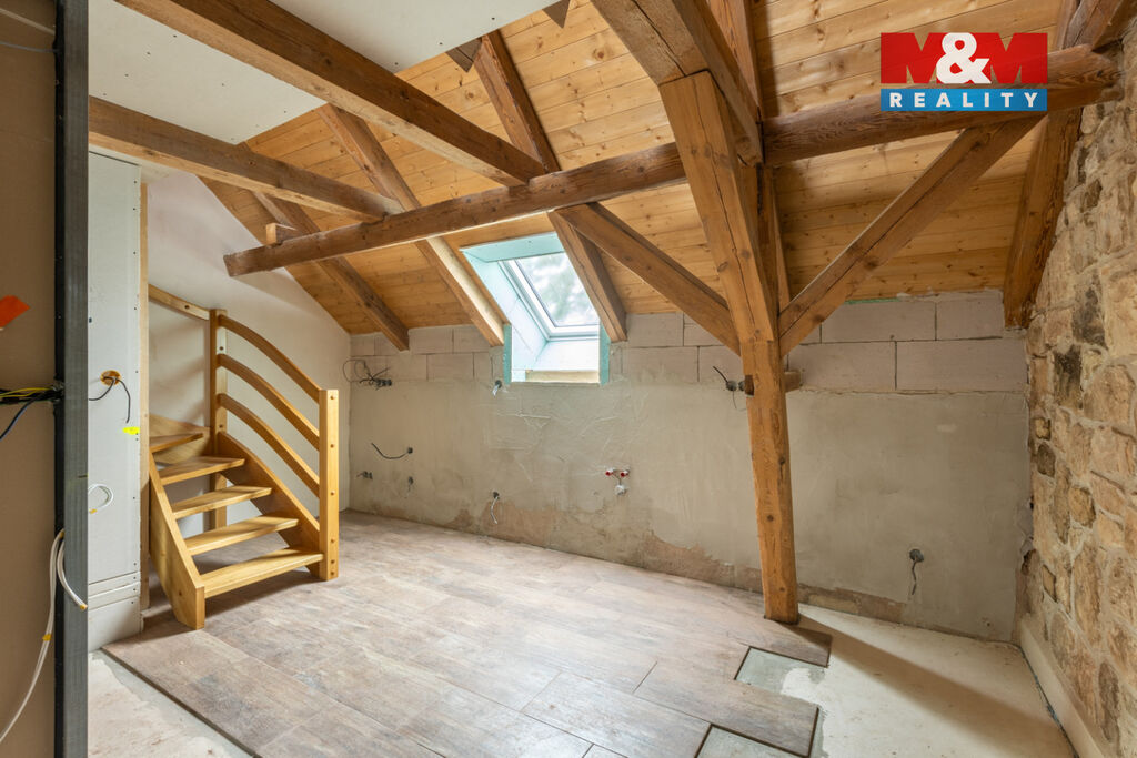 Tento podkrovní mezonetový byt se nachází ve 2. a 3.NP rekonstruovaného domu, ve kterém je více bytů venkovského stylu. Spodní podlaží bytu má 19 m2 a je tu vstupní chodba, obývací pokoj s kuchyňským koutem, WC s umyvadlem a místem pro pračku, je zde jedno střešní okno. V podkroví o velikosti 18,5 m2 je pak otevřená ložnice, ve které bude volně stojící vana s krásným výhledem vikýřem do přírody, dále umyvadlo a komora. Orientace bytu je východ a západ. Dům je zateplen, na střeše jsou nové betonové tašky, PENB typu B. Nízké náklady na energie a vodu. Topení a teplá voda je tepelným čerpadlem, vytápění v podlaze. Voda obecní vodovod, splachování dešťovka. Okna plastová, trojsklo. V domě je bezdrátový internet a společná anténa. Součástí kupní ceny jsou: podlahy, zárubně, dveře, koupelna vč. obkladů, sanity. Ve dvoře objektu bude park s lavičkami a herními prvky pro děti, dále wellness. Parkování zajištěno, možnost i dokoupení garáže. Byt číslo 8.