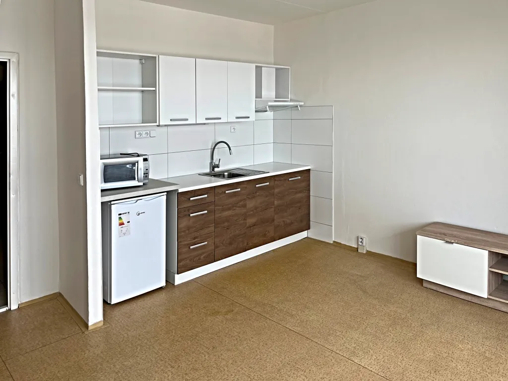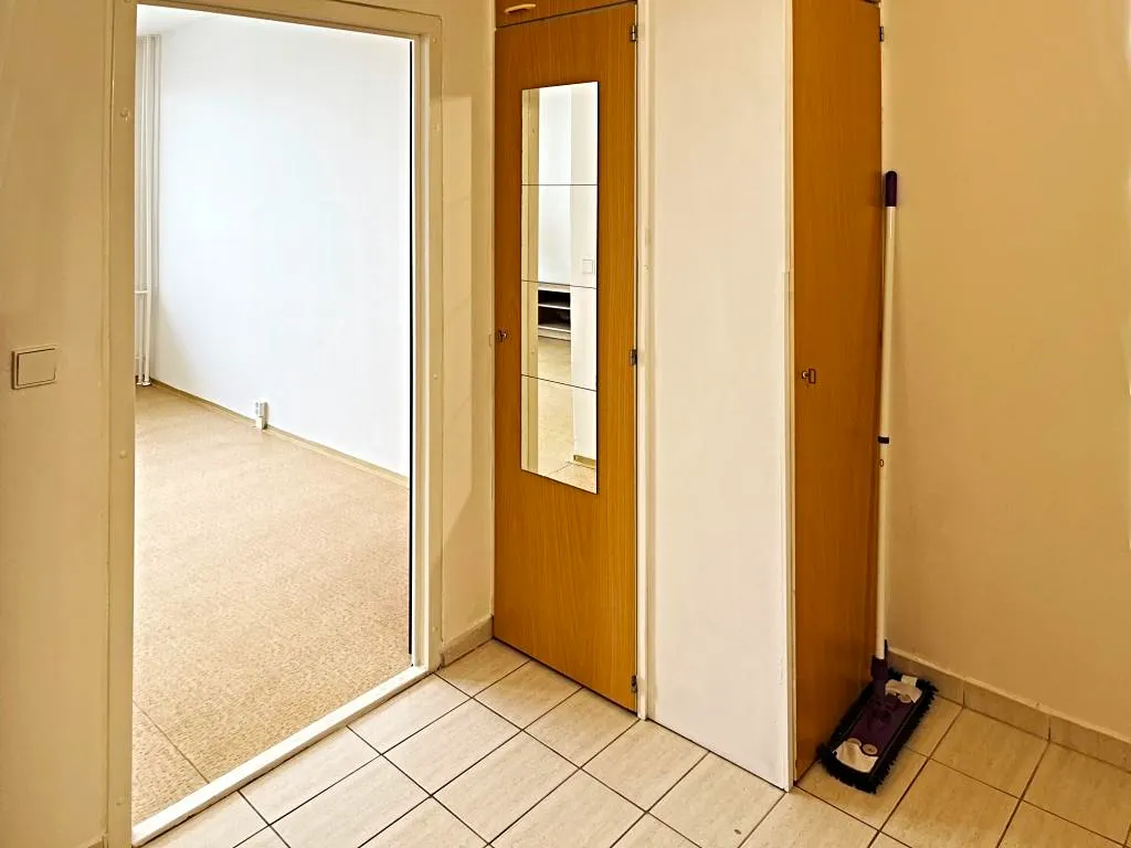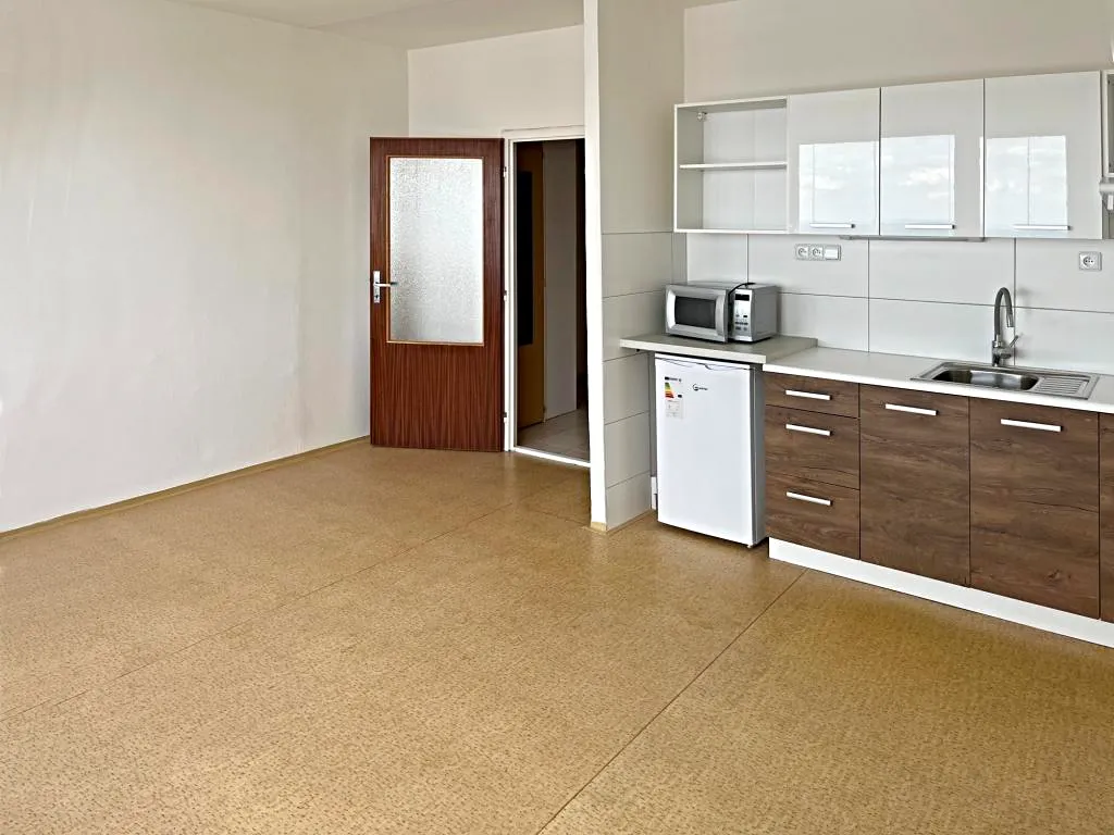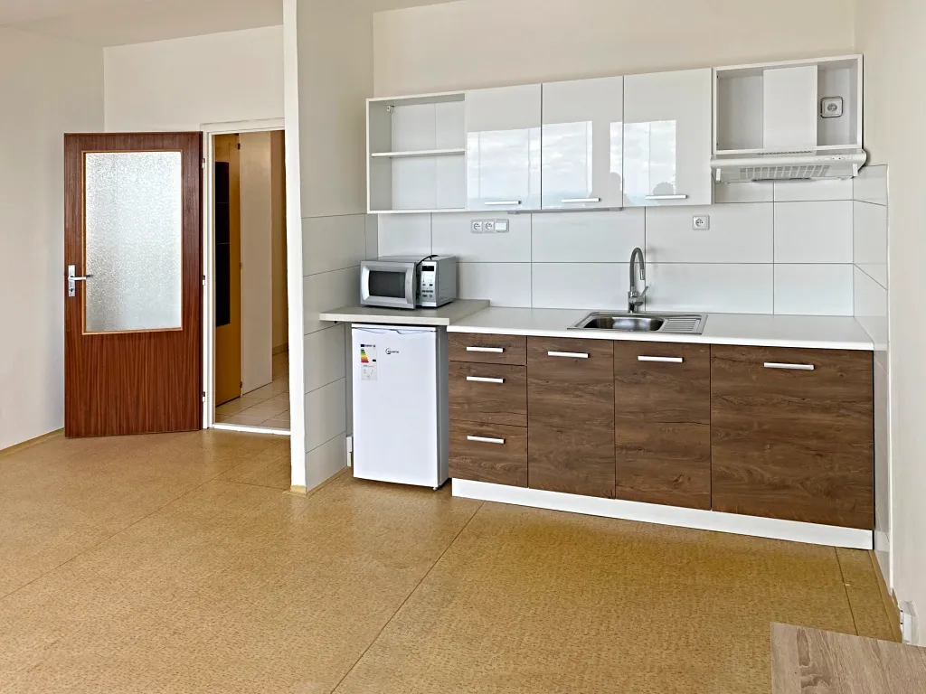 Příjemná předsíň s vestavěnými skříňkami, prostorný pokoj s novou kuch. linkou včetně lednice, dále je zde skříňka na uložení všeho možného.