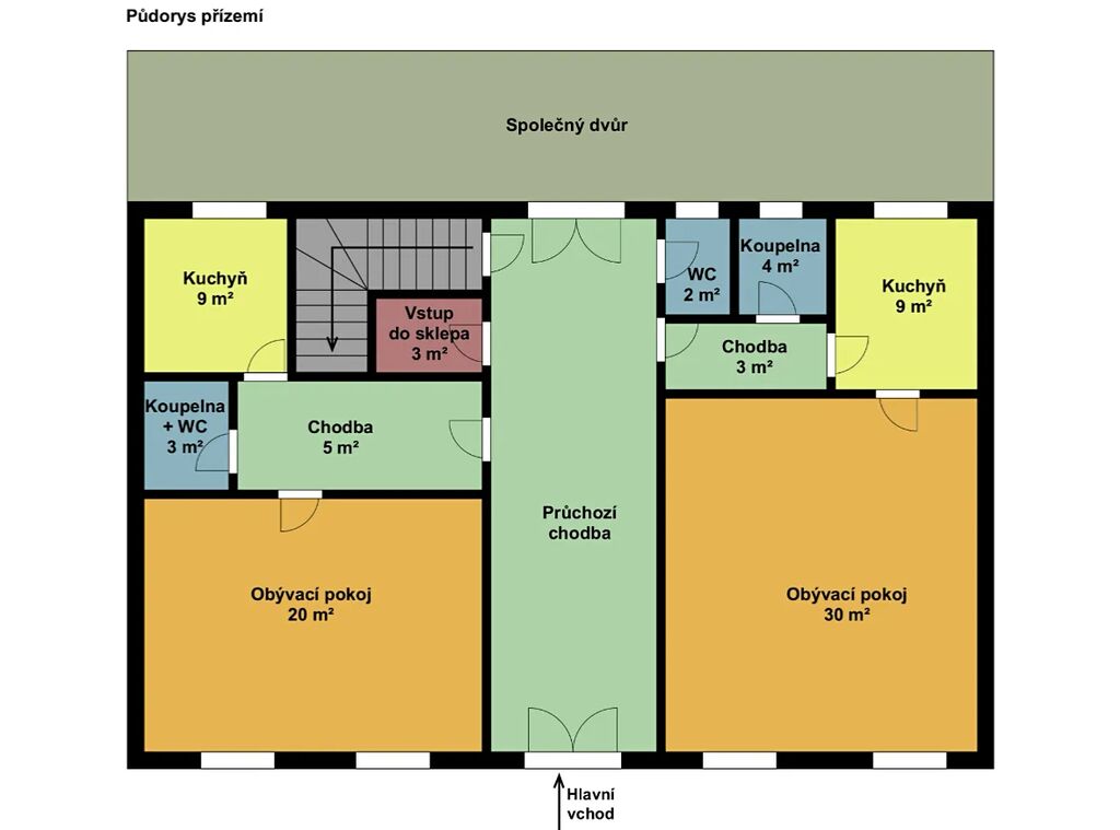 • Společná průchozí chodba: cca 30 m²