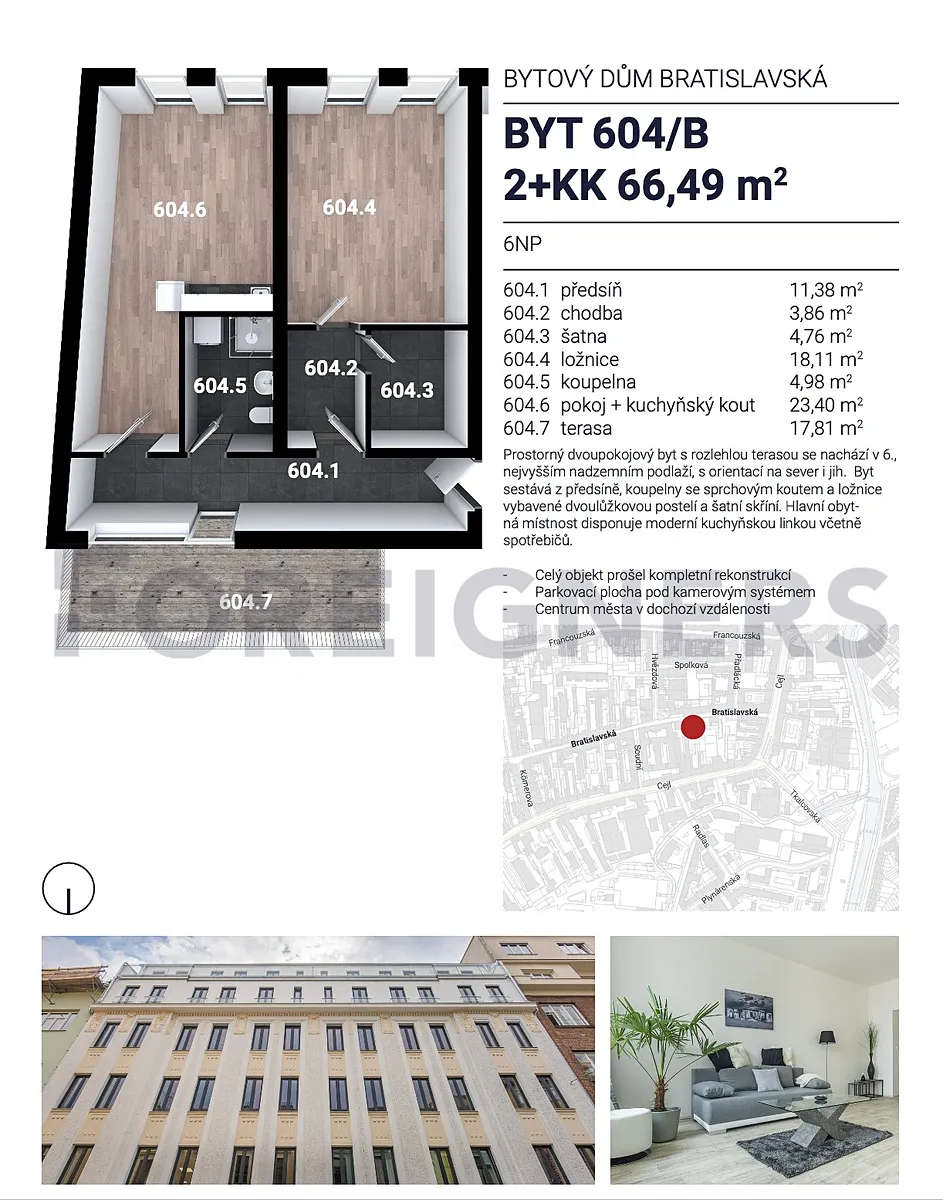 Nabízíme příjemný a útulný byt č. 604B o dispozici 2+kk s terasou, který se nachází v oblíbené brněnské čtvrti Zábrdovice, nedaleko centra města. Byt je ideální pro jednotlivce nebo pár, kteří hledají pohodlné bydlení s výbornou dostupností do centra i dalších částí Brna.
