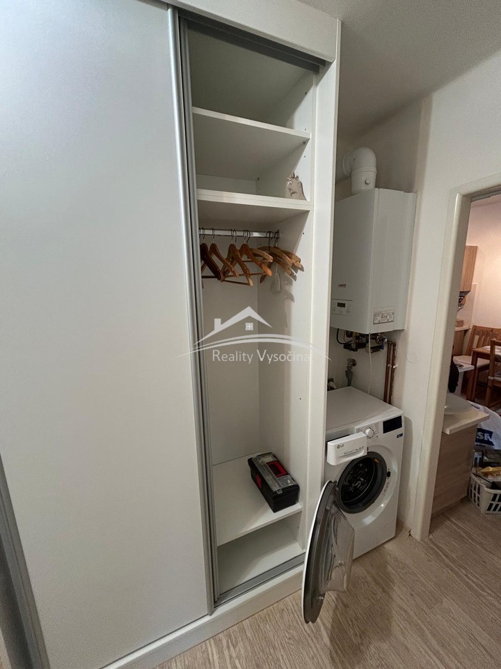 Dispozice zahrnuje zděné jádro s koupelnou vybavenou sprchovým koutem a splachovacím WC, komoru a sklepní kóji. Kuchyň je osazena zánovní linkou s vestavěnými spotřebiči – elektrickým sporákem, horkovzdušnou troubou a digestoří, dále je k dispozici pračka a lednice s mrazákem.