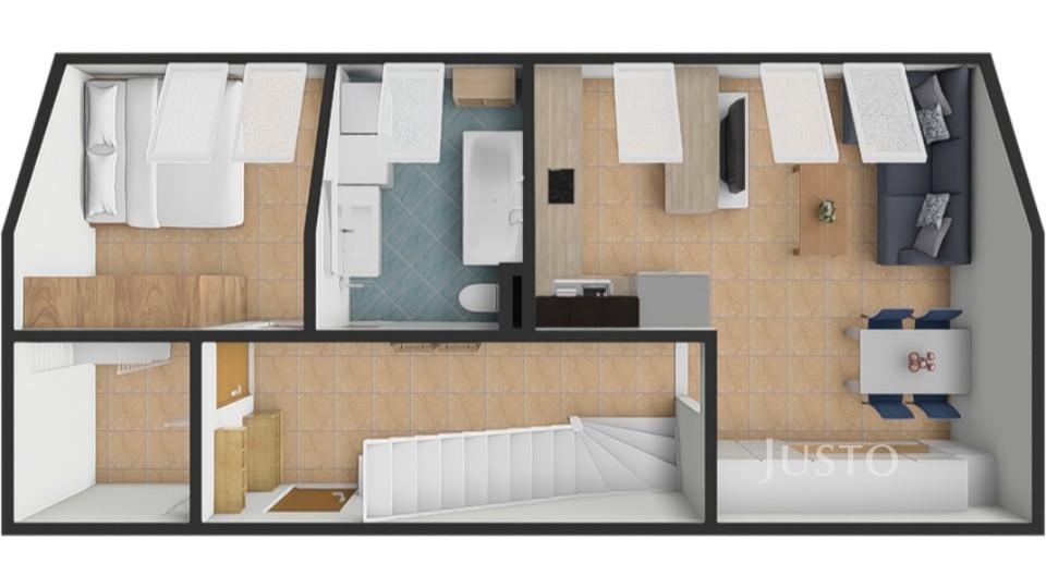 Byt je částečně vybavený a jeho interiér je udržovaný v moderním standardu. Podkrovní část nabízí vzdušné a prosvětlené pokoje s eurookny, které propouštějí dostatek denního světla. Prostor je řešen velmi prakticky, s dostatkem úložných míst (šatna, prostor pod schody, prostor na chodbě v mezonetu) a promyšleným rozmístěním nábytku. Pokoje jsou ideální pro dětské hry, studium i klidný odpočinek. V koupelně naleznete vanu, toaletu, moderní umyvadlo a také místo pro pračku se sušičkou. Kuchyň je vybavena kuchyňskou linkou na míru.
