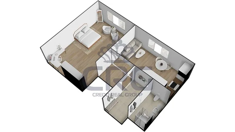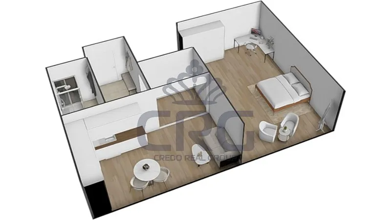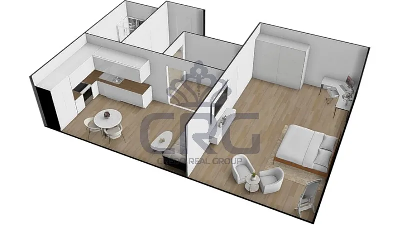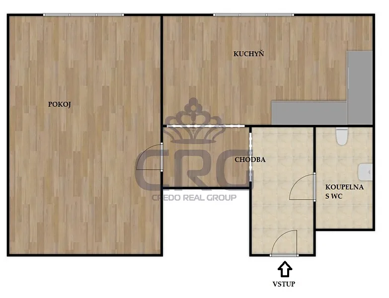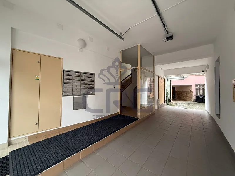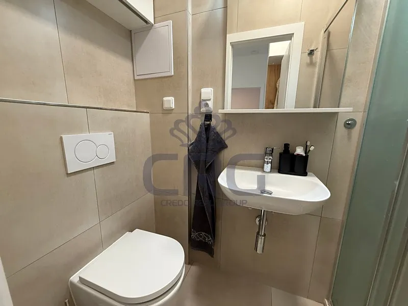 Za vstupními dveřmi se nachází útulná a krásná chodba (cca 4,50 m2) s věšáky a úložným prostorem. Po pravé straně je krásná koupelna s WC, sprchovým koutem, umyvadlem, zrcadlem a koupelnovou skříňkou. Koupelna s toaletou je o výměře cca 2,20 m2. Hlavní dominantou je místnost s kuchyňským koutem o velikosti cca 15,10 m2. Kuchyňská linka je vybavena lednicí s mrazákem značky Whirlpool, sklo keramickou varnou deskou značky Whirlpool, troubou značky Whirlpool, myčkou nádobí značky Whirlpool a pračkou značky AEG. Velkou výhodou je spoustu úložného prostoru v kuchyňské lince. Vedle této krásné linky se nachází vestavěná skříň. V neposlední řadě se zde nachází prostorný pokoj o výměře cca 24,10 m2, který může sloužit jako ložnice, ale zároveň, díky své velikosti, lze zde mít i obývací pokoj. Pokoj s kuchyňským koutem a samostatný pokoj jsou orientovány na Jihovýchod.