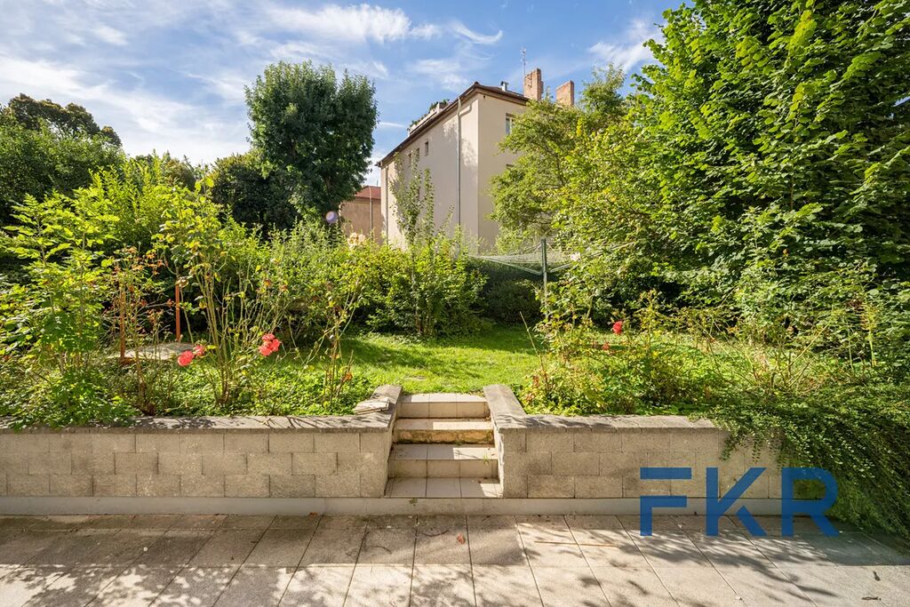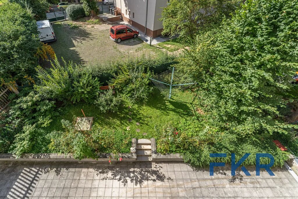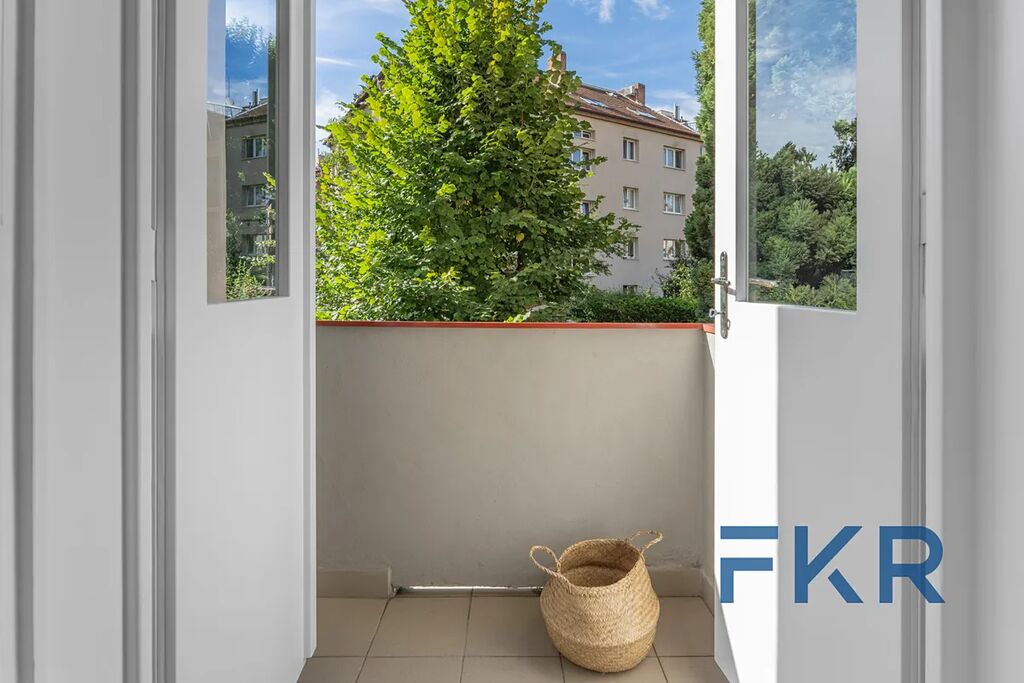 Balkón v bytě s výhledem do společné zahrady může nabídnout klidné prostředí k posezení po náročném dni. Součástí prodeje je i sklep (2.7 m²) v suterénu budovy.