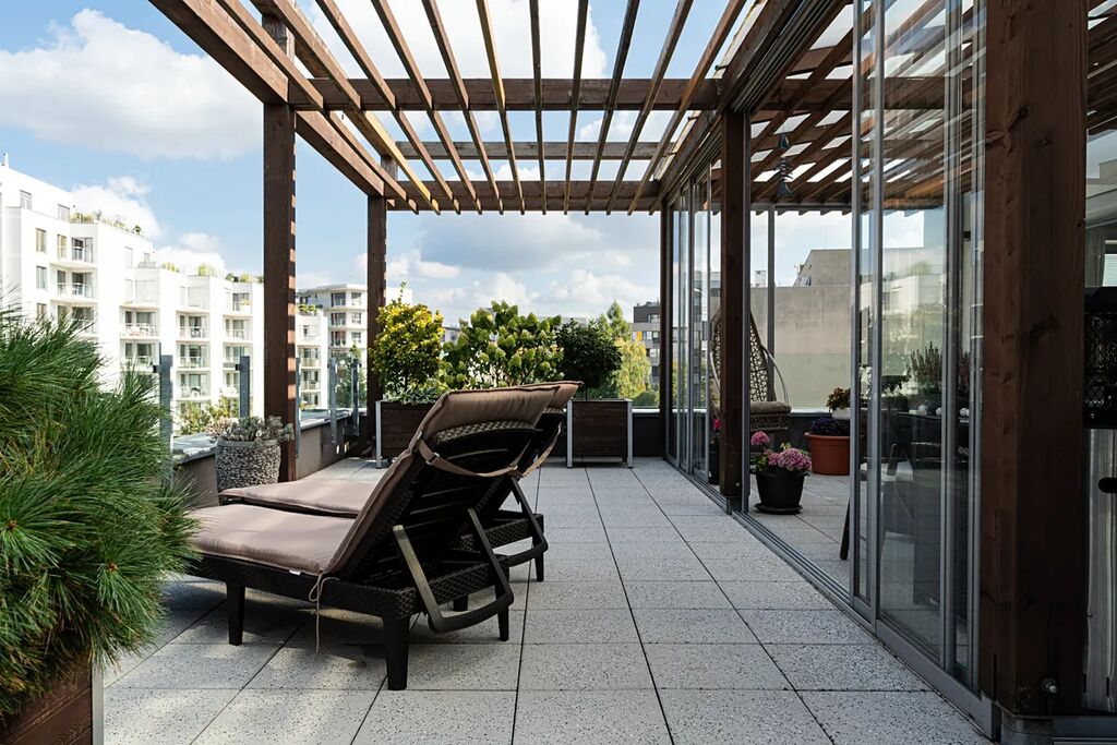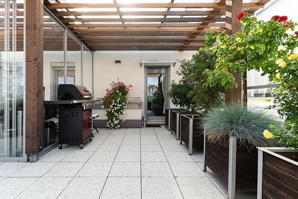 Francouzská okna v obývacím i dětském pokoji umožňují vlastní vstup na prostornou terasu, která je částečně zastřešená, což zajišťuje její pohodlné využívání i za nepříznivého počasí. Součástí terasy je nově vybudovaná zimní zahrada o rozměrech 2,8 × 6,6 metru.